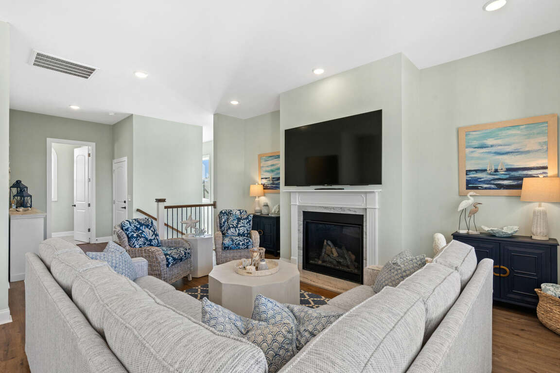 Entertainment Options: The living area is equipped with a TV, perfect for movie nights or catching up on your favorite shows. The sectional couch provides ample seating for everyone to gather and enjoy quality time together. Additionally, the fireplace adds a cozy touch, creating a warm ambiance on cooler evenings.