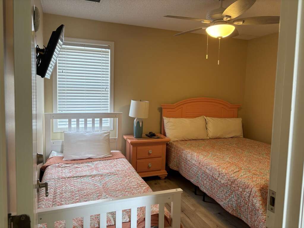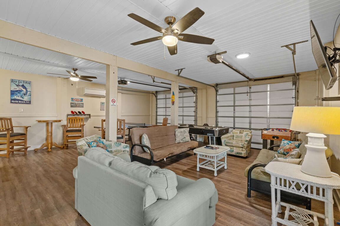 The upper level has 2 bedrooms. One bedroom has a queen bed, twin bed, and 32" smart TV. The other bedroom has a queen bed and 32" smart TV. These rooms share a full bathroom The game room includes a full size air hockey table, ping-pong and foosball table, and another 55"smart TV. In the game room are a kitchenette, 2 futons, couch, and a full bath. The room also has 3 bar height tables with seating for six and easy access to the covered outdoor grilling/lounging space.