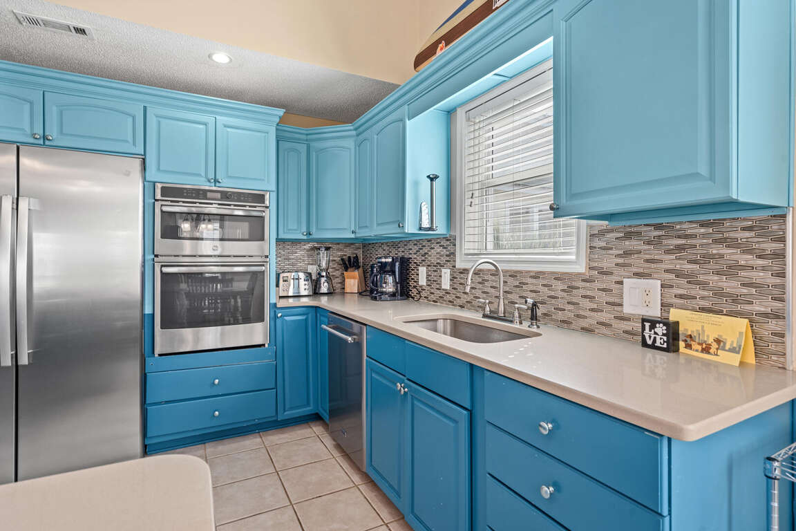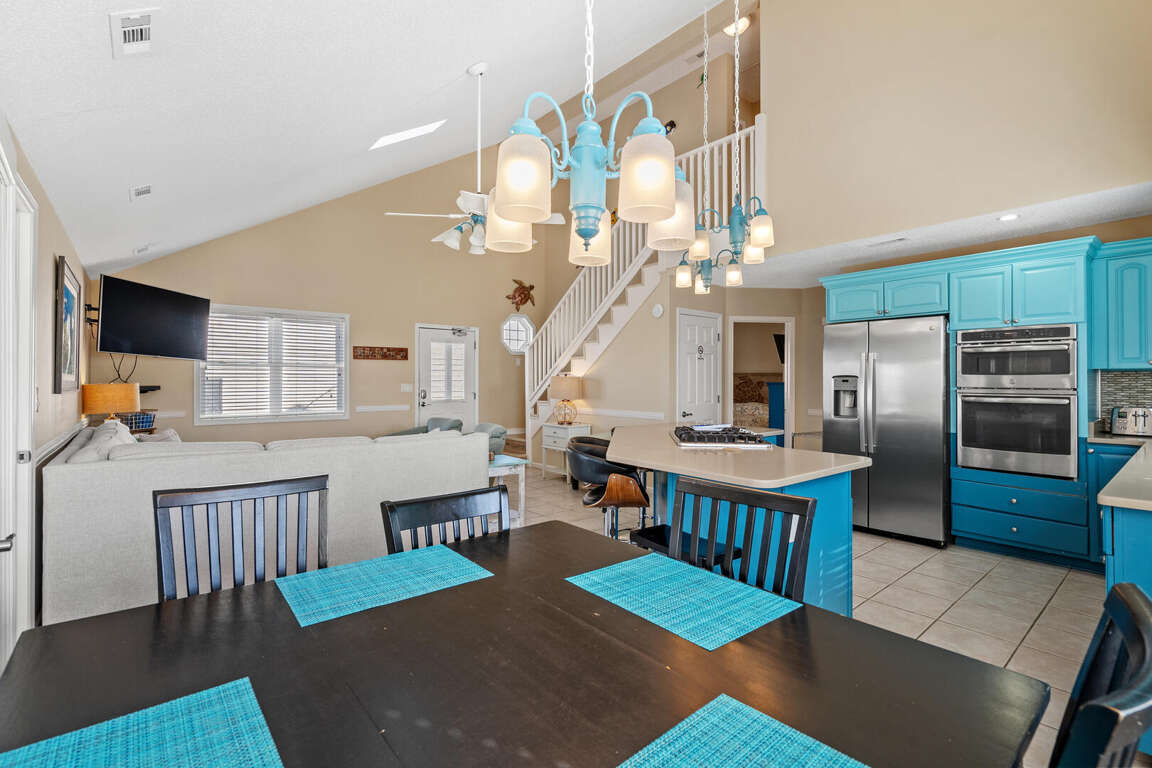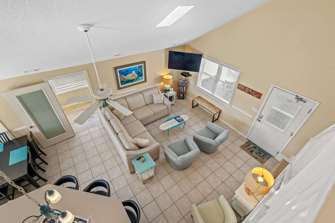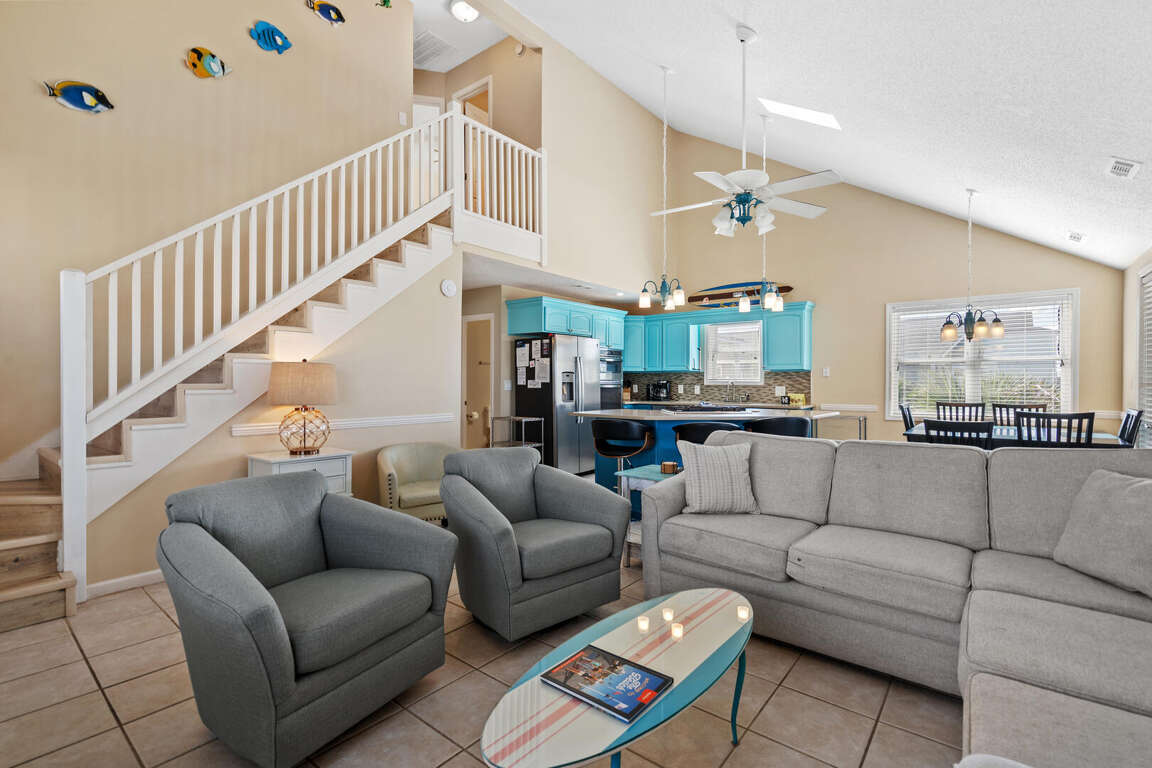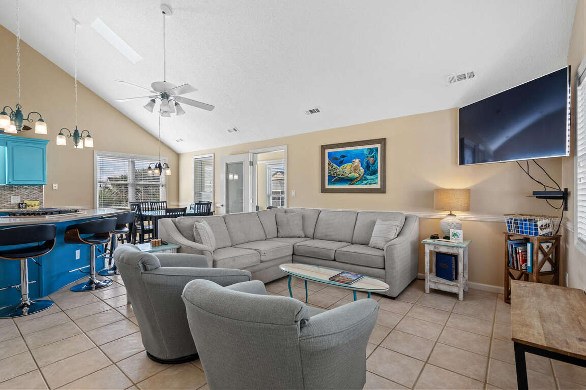 Turtle Groove is a 4 bedroom, 3 bath pet friendly home located in the Cherry Grove section of North Myrtle Beach. This home sleeps 9. Turtle Groove is on the 2nd row (300 feet from the ocean) with an ocean view and channel view. The main living area is an open plan with tile floors, loveseats, swivel chairs and a 55" smart 4k TV and blu-ray player. All TVs include streaming YouTubeTV (which is like cable/dvr), and add-free Hulu service. There is also a well stocked kitchen with quartz counters, gas cook top and seating for 10 (table plus bar). This house also includes 1Gb speed internet and WIFI.