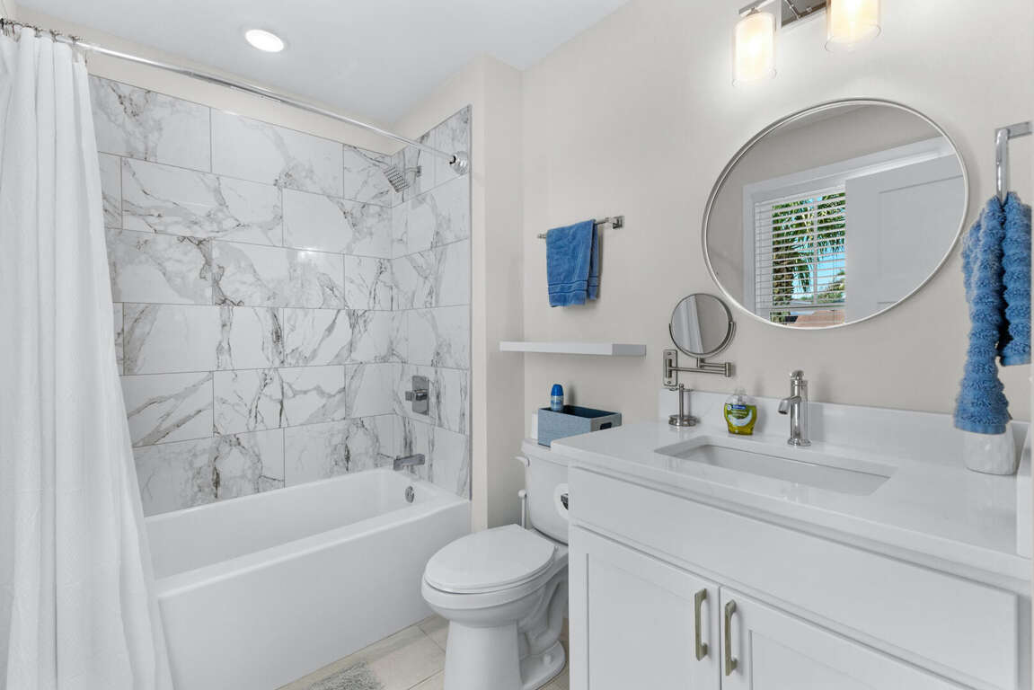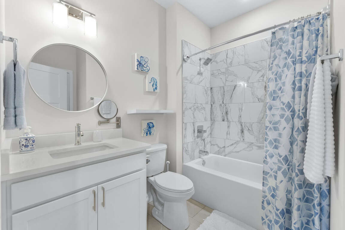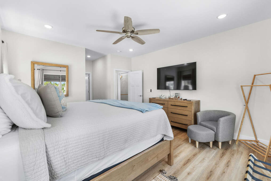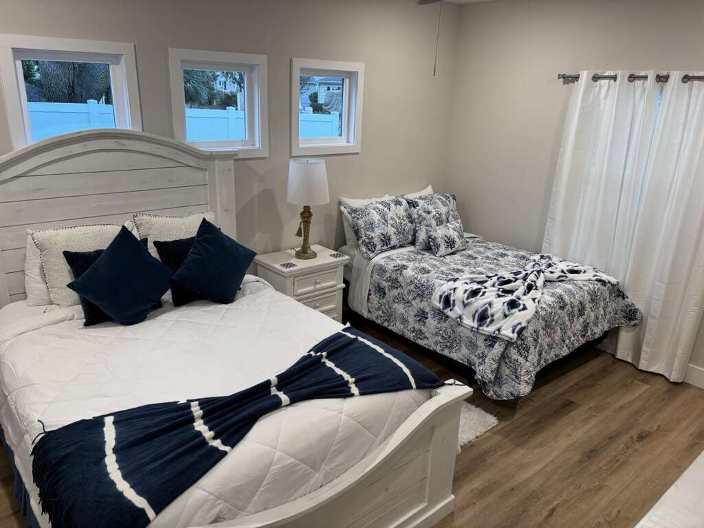 On the lower floor are the other two bedrooms. This master suite has a king bed, Smart TV, and bathroom with a tub and shower combination. The other bedroom has a queen bed, full size bed, Smart TV, and bathroom with tub and shower combination. Also on this floor is the washer and dryer. WiFi is free. An outside shower with a hose is available for rinsing off after a day at the beach. Gather around the outdoor sitting area with table and chairs to plan your next vacation day.
