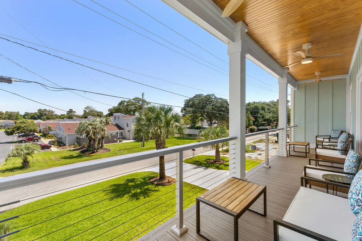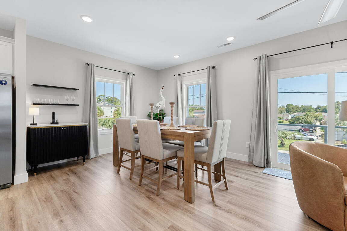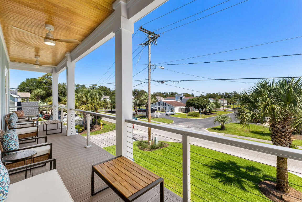 This home comfortably sleeps 10. On the main level (top floor) of this North Myrtle Beach rental is the open kitchen, dining, and living area. The new kitchen is equipped with all new appliances, an island, cookware, utensils, etc. necessary to prepare your favorite meals. The dining table seats 6 and there are 4 stools at the kitchen island. The living area has a queen sleeper sofa, Smart TV, and access to the covered front porch that stretches across the front of the entire home; perfect for morning coffee, afternoon drinks, and maybe a peaceful vacation nap. The front porch has ceiling fans, seating for 8, and has balcony railing. There is a master suite on this floor with a king bed, Smart TV, and a master bath with a walk-in shower.