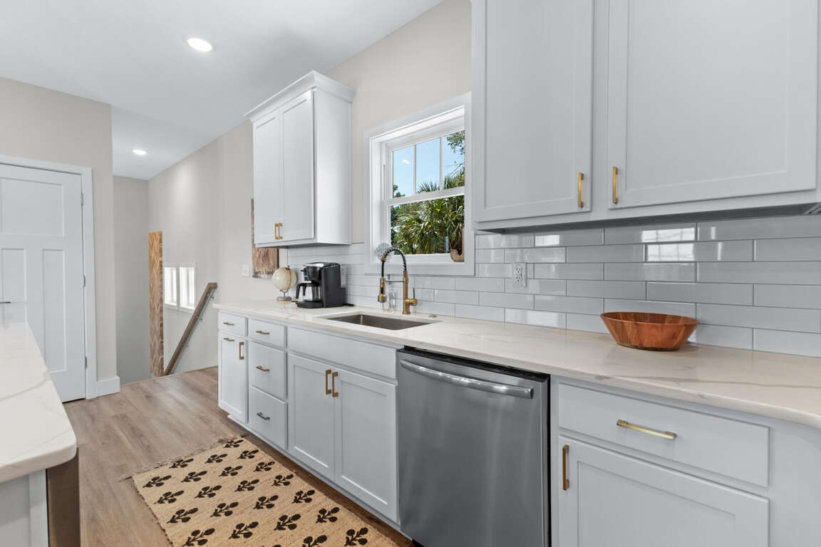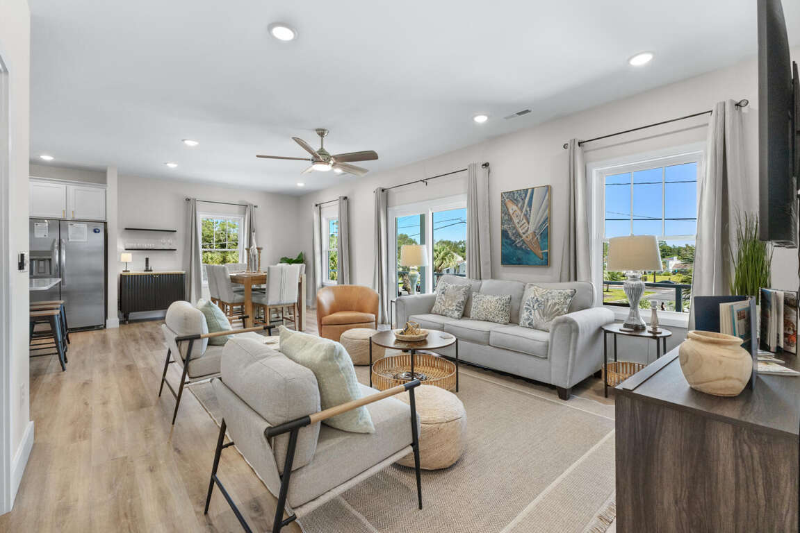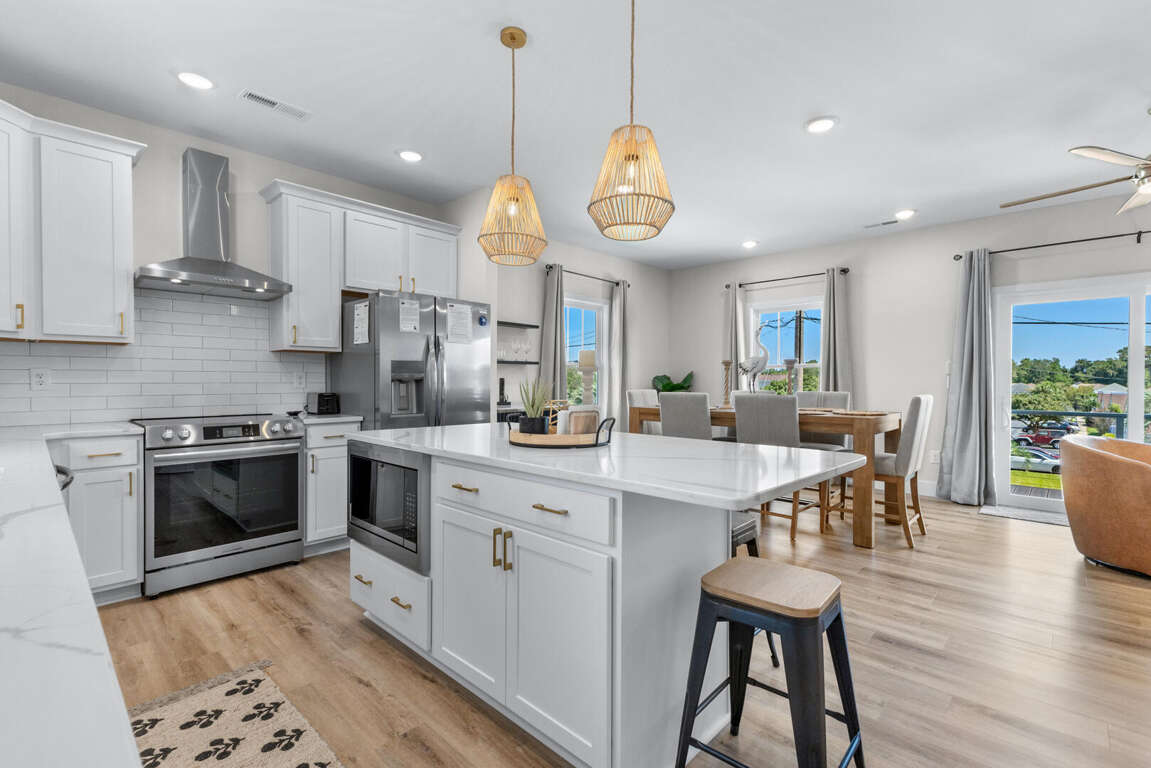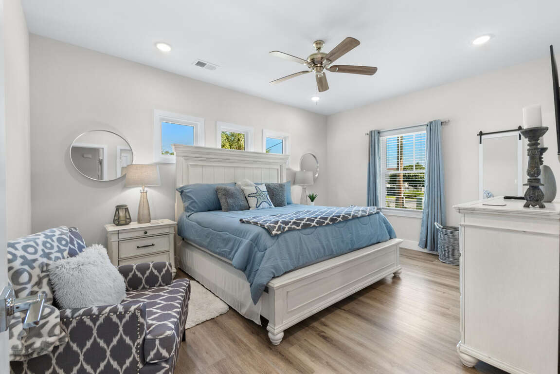 This home comfortably sleeps 10. On the main level (top floor) of this North Myrtle Beach rental is the open kitchen, dining, and living area. The new kitchen is equipped with all new appliances, an island, cookware, utensils, etc. necessary to prepare your favorite meals. The dining table seats 6 and there are 4 stools at the kitchen island. The living area has a queen sleeper sofa, Smart TV, and access to the covered front porch that stretches across the front of the entire home; perfect for morning coffee, afternoon drinks, and maybe a peaceful vacation nap. The front porch has ceiling fans, seating for 8, and has balcony railing. There is a master suite on this floor with a king bed, Smart TV, and a master bath with a walk-in shower.
