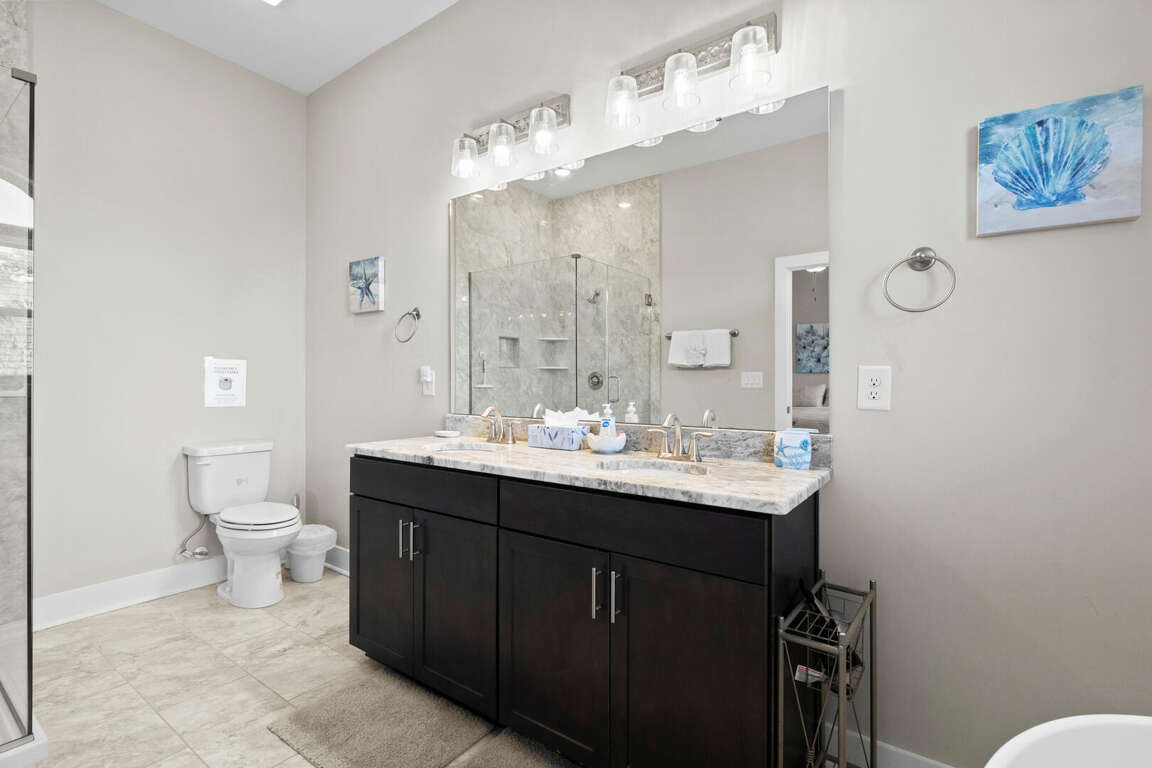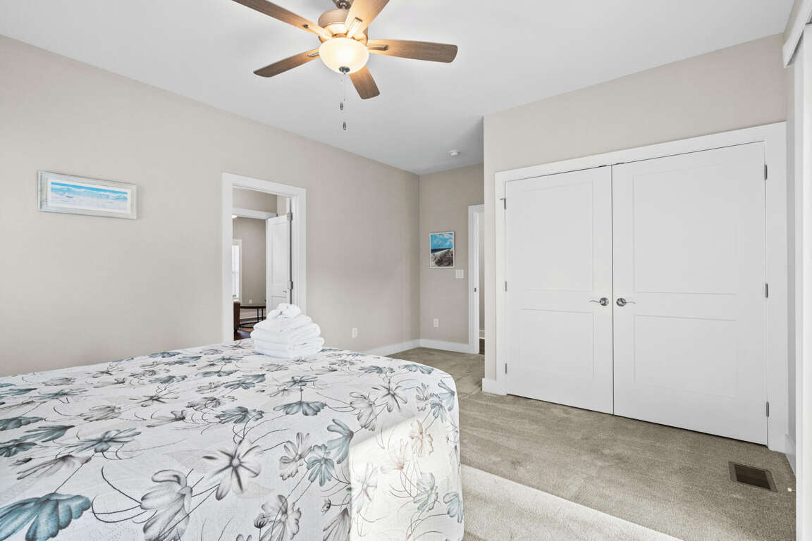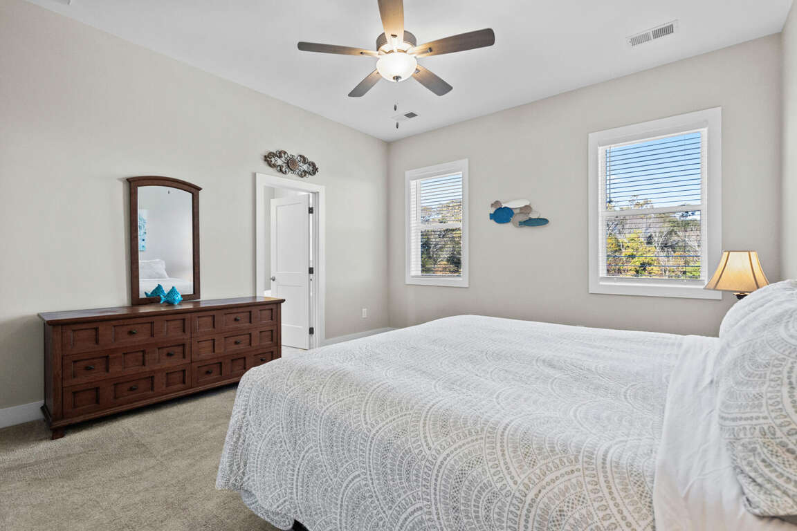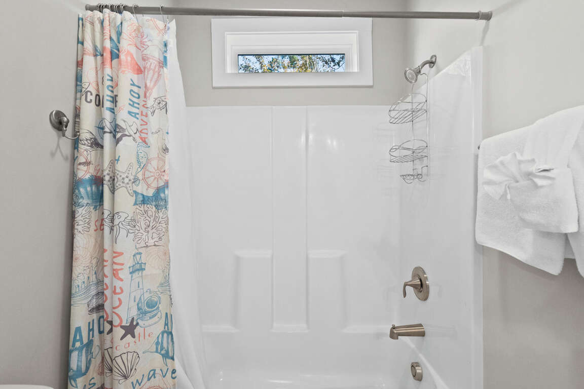 The North Myrtle Beach vacation rental has 4 bedrooms. There are 3 bedrooms on the 2nd floor. There is a jack and jill bathroom with a tub and shower combination connecting a queen bedroom and a king bedroom. There is another bedroom with a queen bed and a bathroom with a walk-in shower. A bonus living area on the 2nd floor has a PS4. Guests should bring their favorite controllers and games for the PS4.