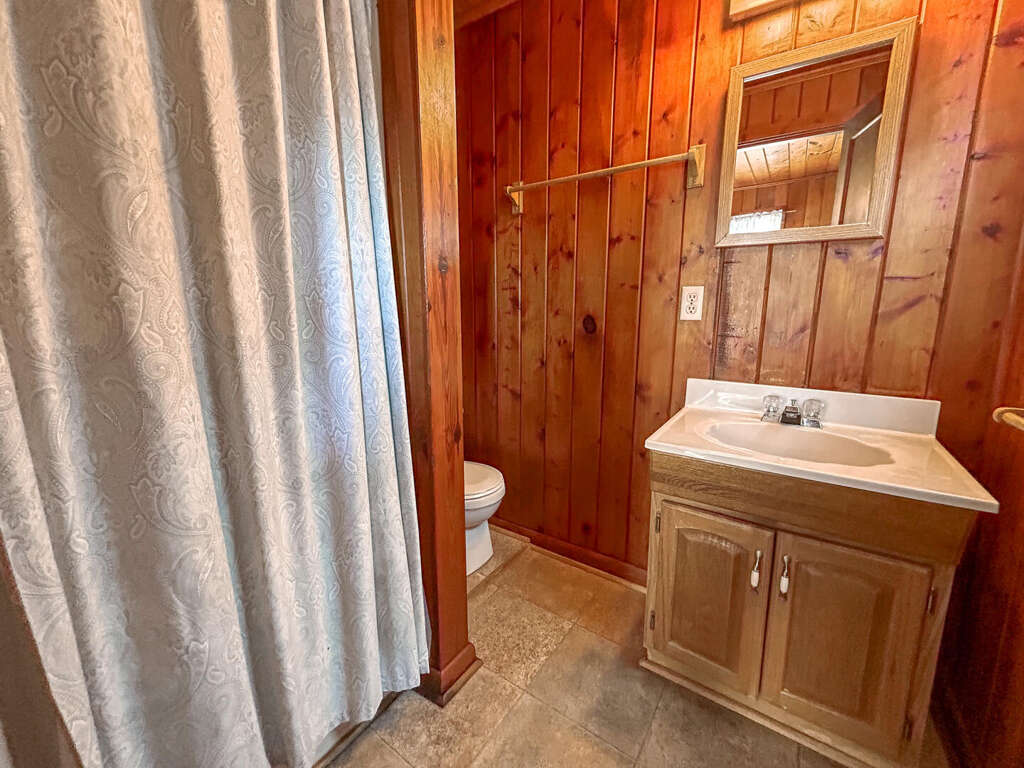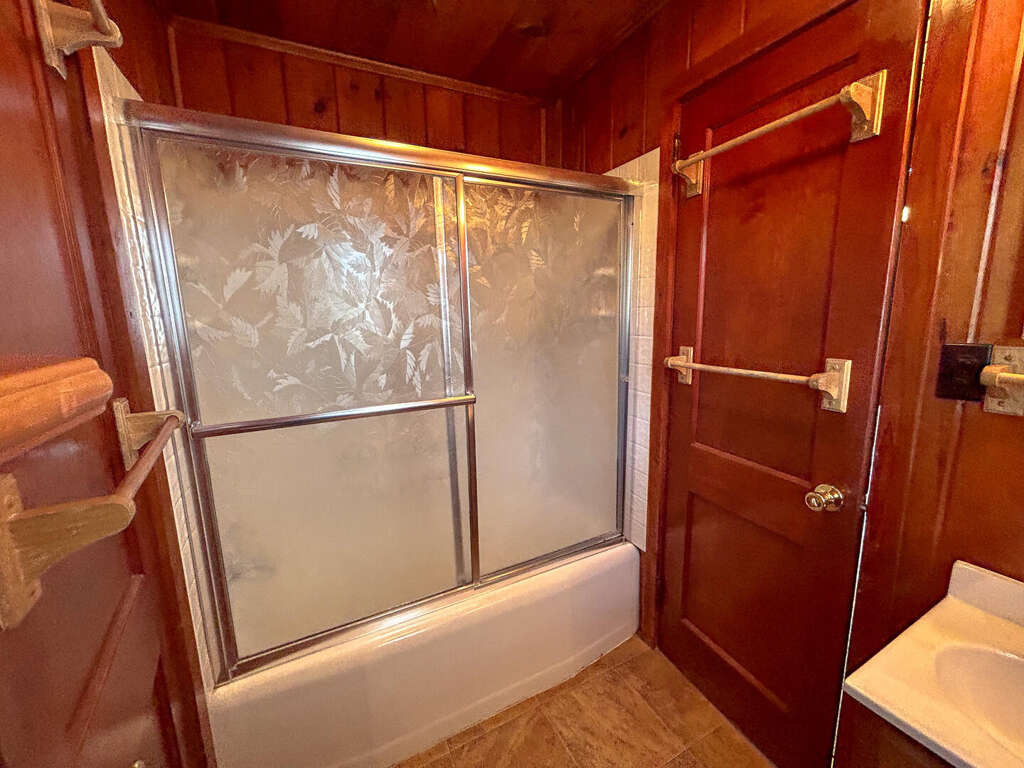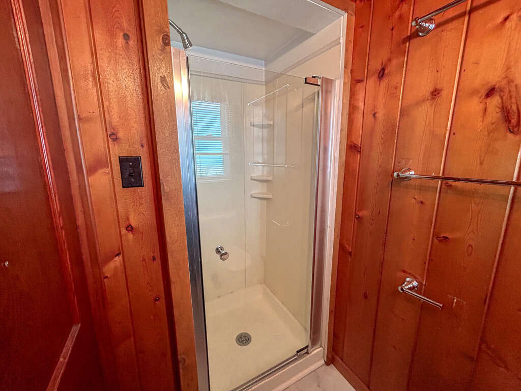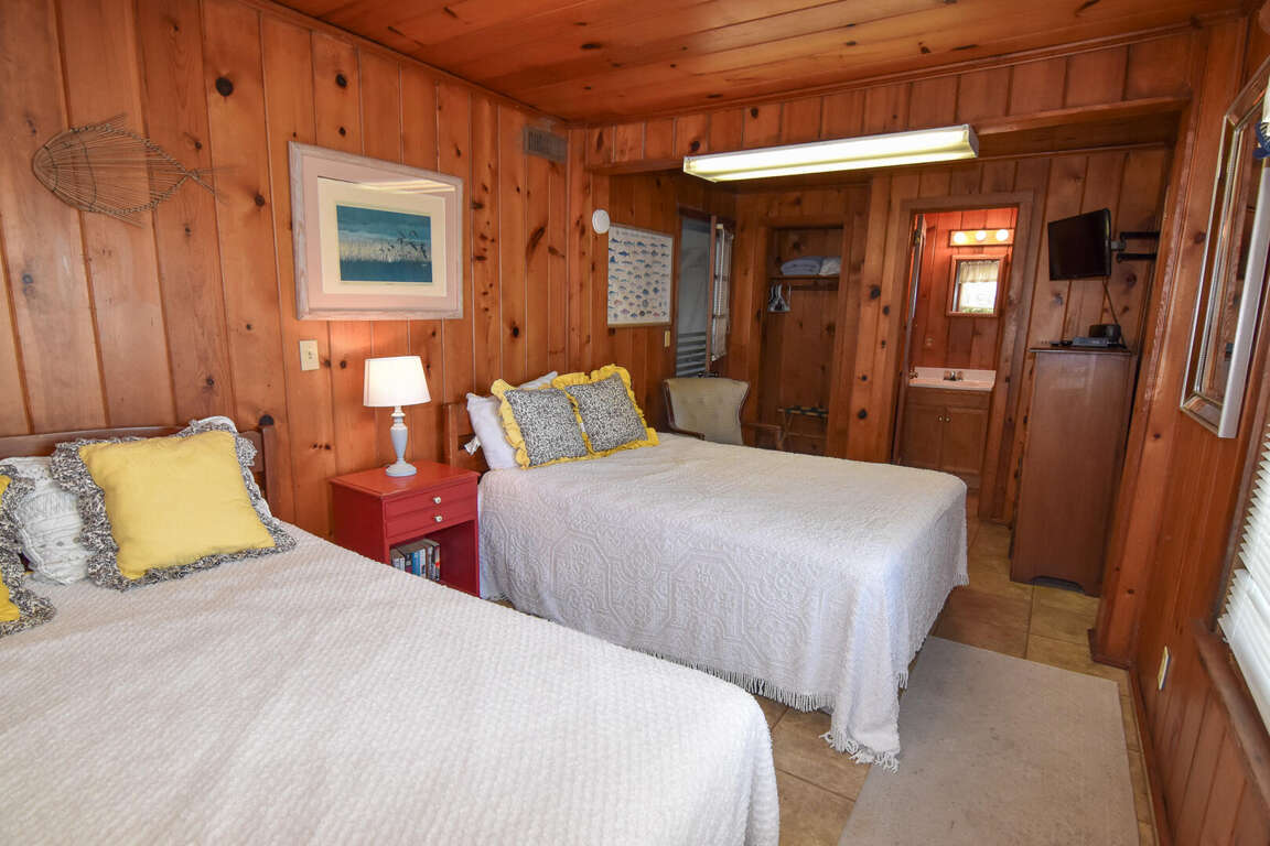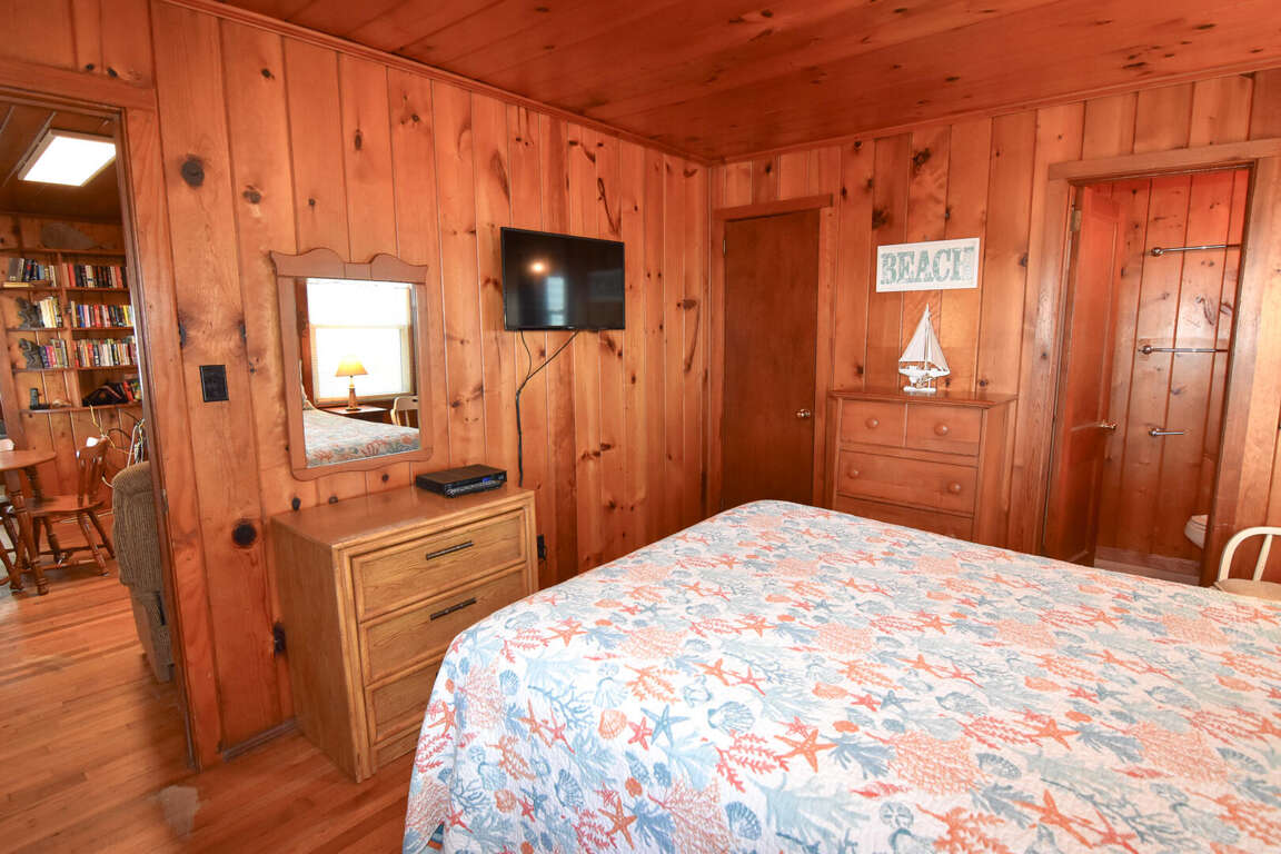 North Myrtle Beach rental home The Shell has 3 bedrooms on the upper level of the home and two bedrooms located on the ground level. The master bedroom and second bedroom each has a queen bed and television. The third bedroom has 2 twins and a television. The fourth bedroom, which is on the ground level with a separate entrance, has a queen bed and a full bathroom. The fifth bedroom, also on the ground level with a separate entrance, has 2 double beds and a television with a half bath. There is a separate enclosed shower and laundry room on the ground level. The entrance to the upper level from the bottom level is from the outside stairs only. The televisions are Smart TVs with streaming. (You have to log in with your own account.) There is no cable TV.