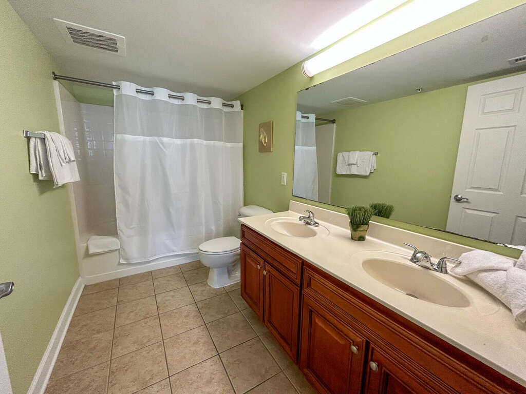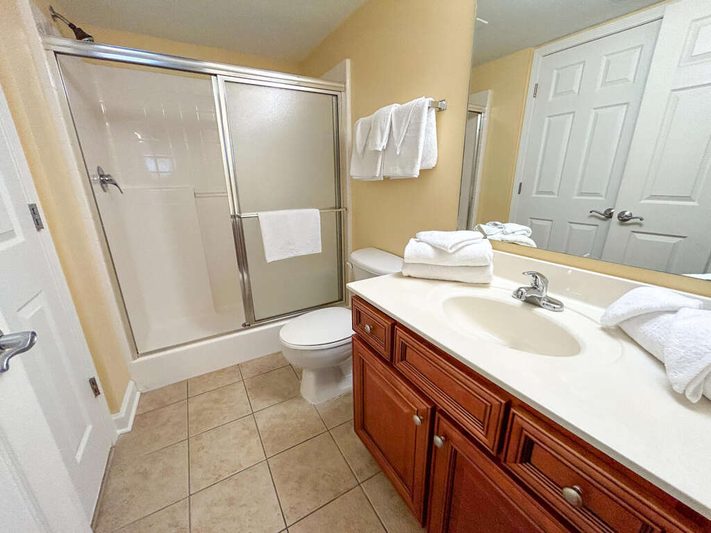 The master suite is designed as a private sanctuary, featuring a luxurious king-sized bed, flat-screen TV, and direct access to its own en-suite bath. This bathroom includes a tub/shower combination, allowing you to unwind after a long day of fun in the sun. The second bedroom provides two plush queen beds—perfect for children, teens, or friends traveling together—while the third bedroom includes a cozy queen bed for additional comfort. Each bedroom offers its own flat-screen TV, making it easy for everyone to relax with their favorite shows. With three bathrooms in total, all equipped with tub/shower combos, getting ready is a breeze even for larger groups.