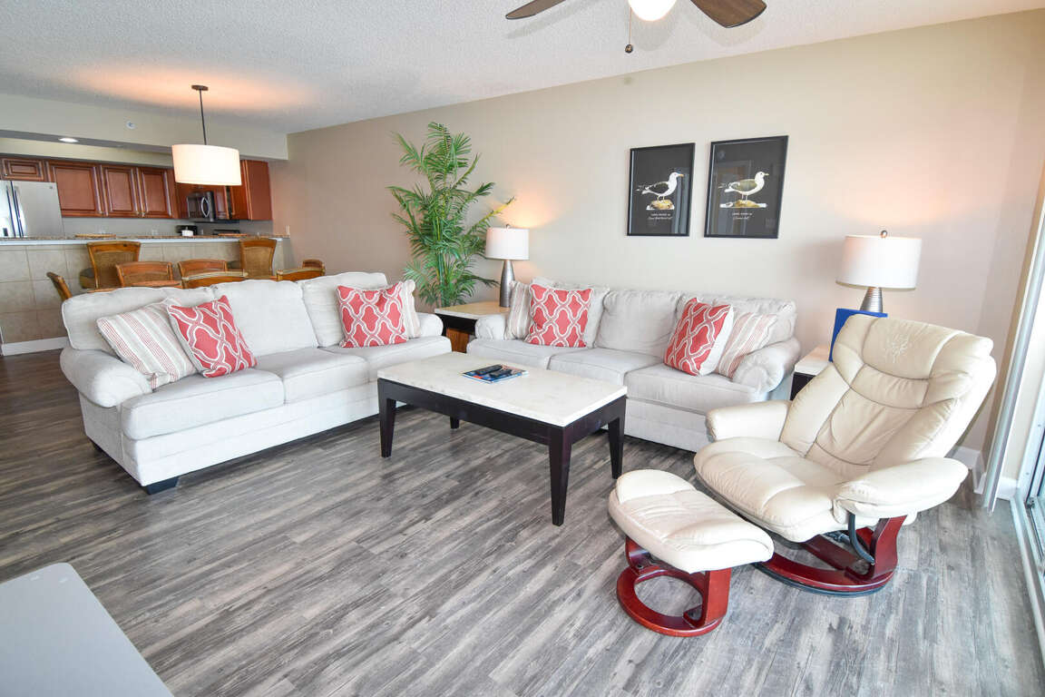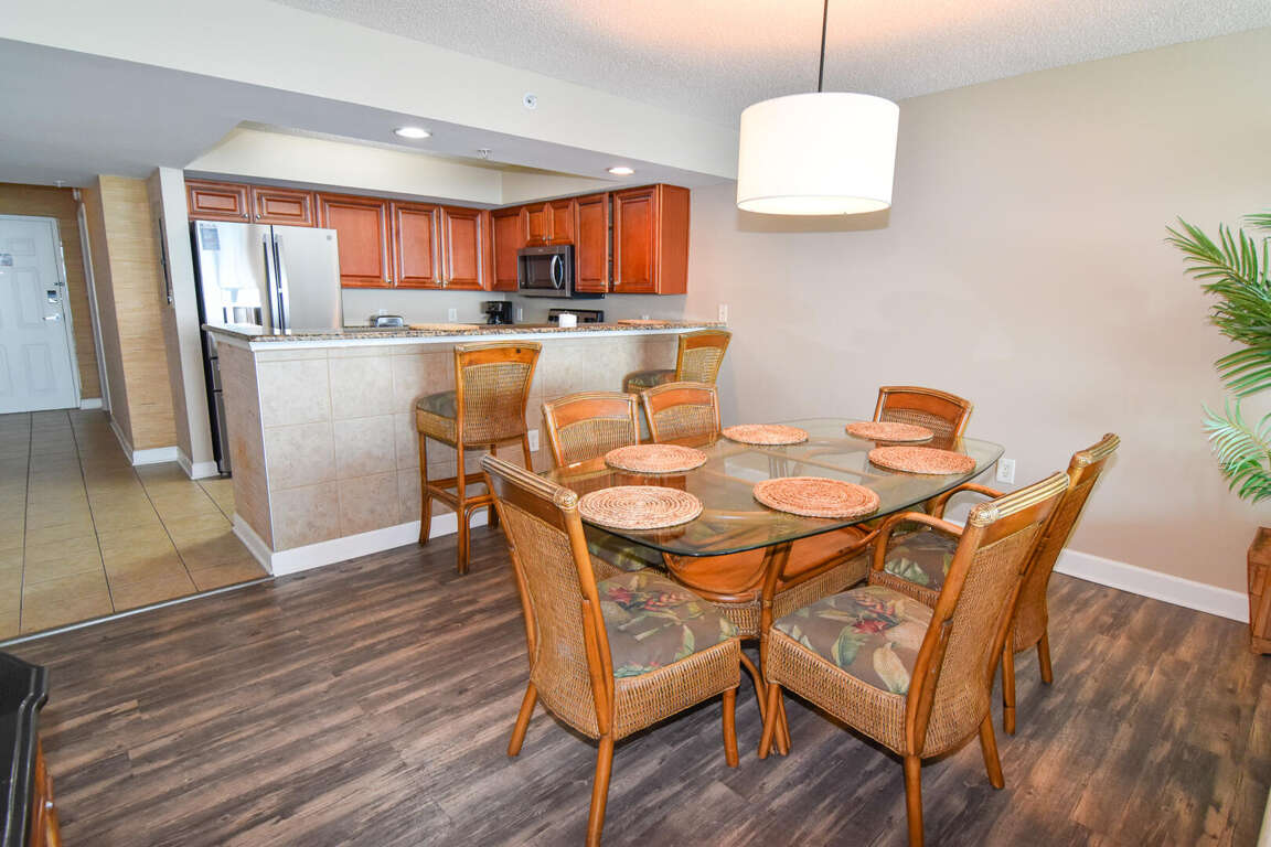 The heart of the condo is its open-concept living and dining space. Floor-to-ceiling sliding glass doors allow plenty of natural light to flood the room, while also giving you an unobstructed view of the ocean. The living area is furnished with comfortable seating, perfect for gathering for movie nights, family conversations, or simply soaking in the view. Step out onto the private balcony to sip your morning coffee as the sun rises over the horizon, or enjoy an evening glass of wine while listening to the calming rhythm of the waves.