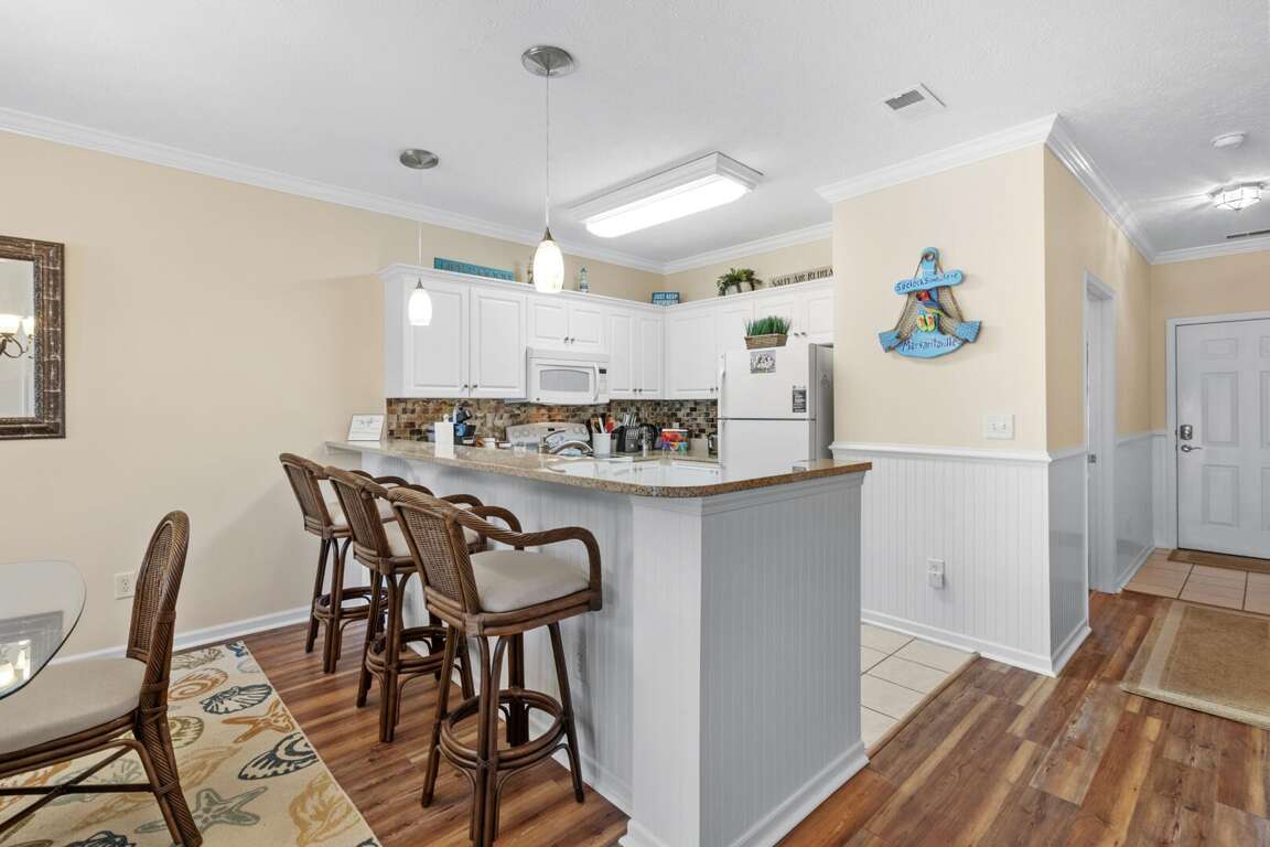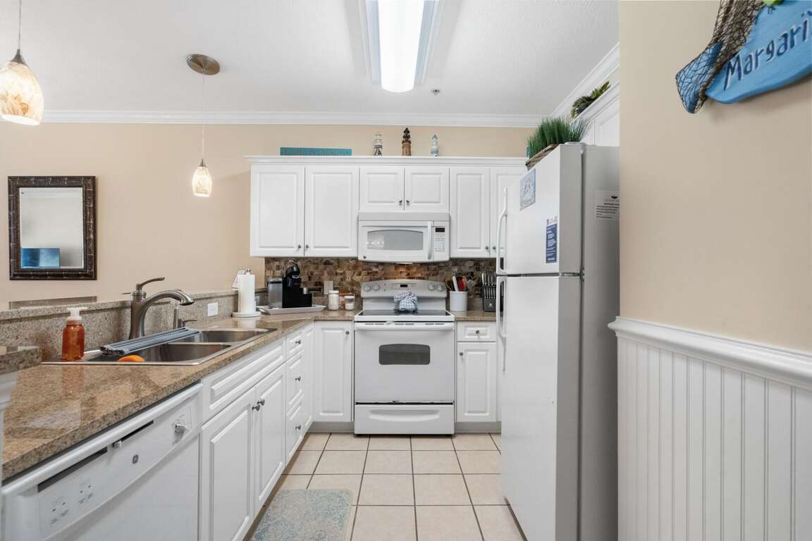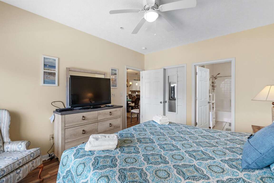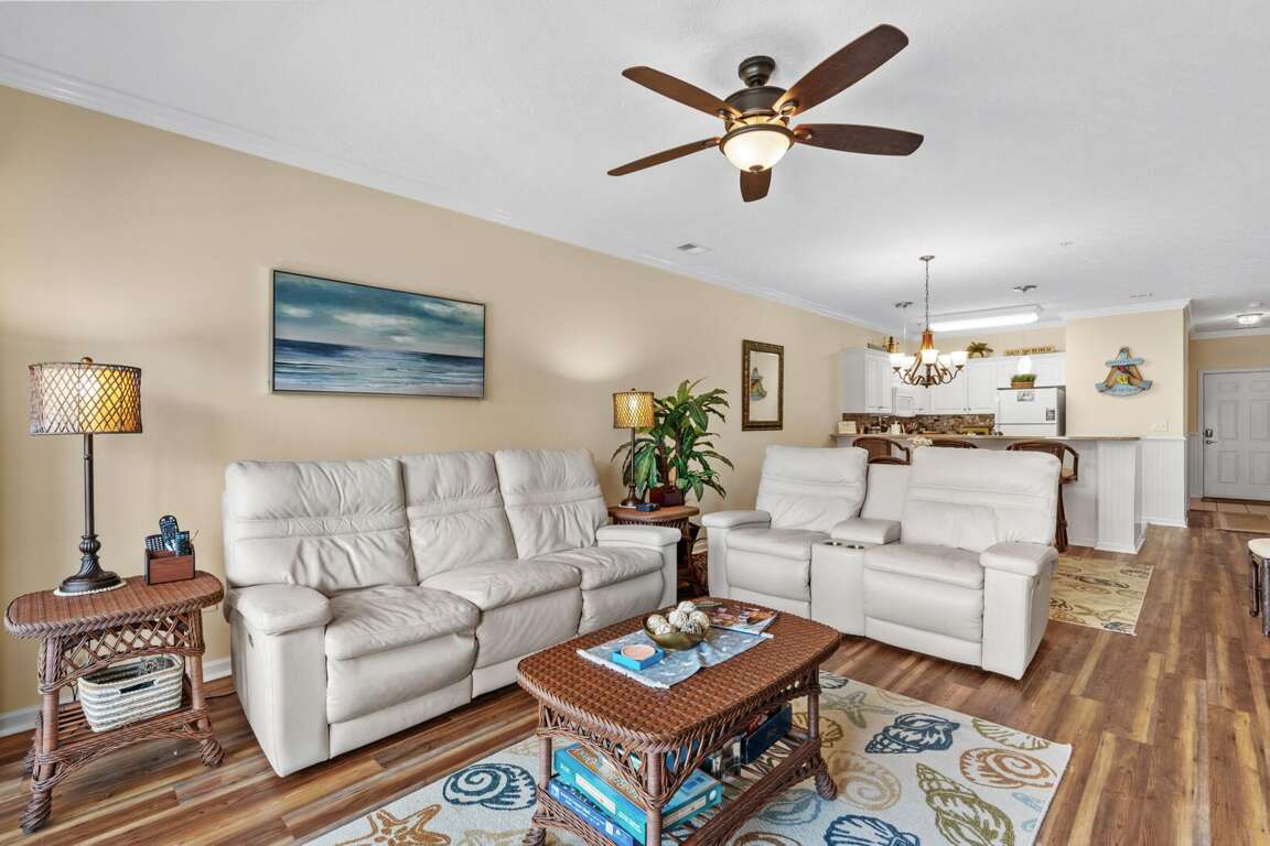 3 bedroom, 2 bath condo in gated community. Sleeps 6. King, Queen, 2 Twins. Pool view. 3rd floor. Elevator. Outdoor pool, hot tub, fitness center, tennis court, grilling area (gas grill). Golf cart allowed. No pets, motorcycles, smoking. No students/student groups. Must be 25 to rent.