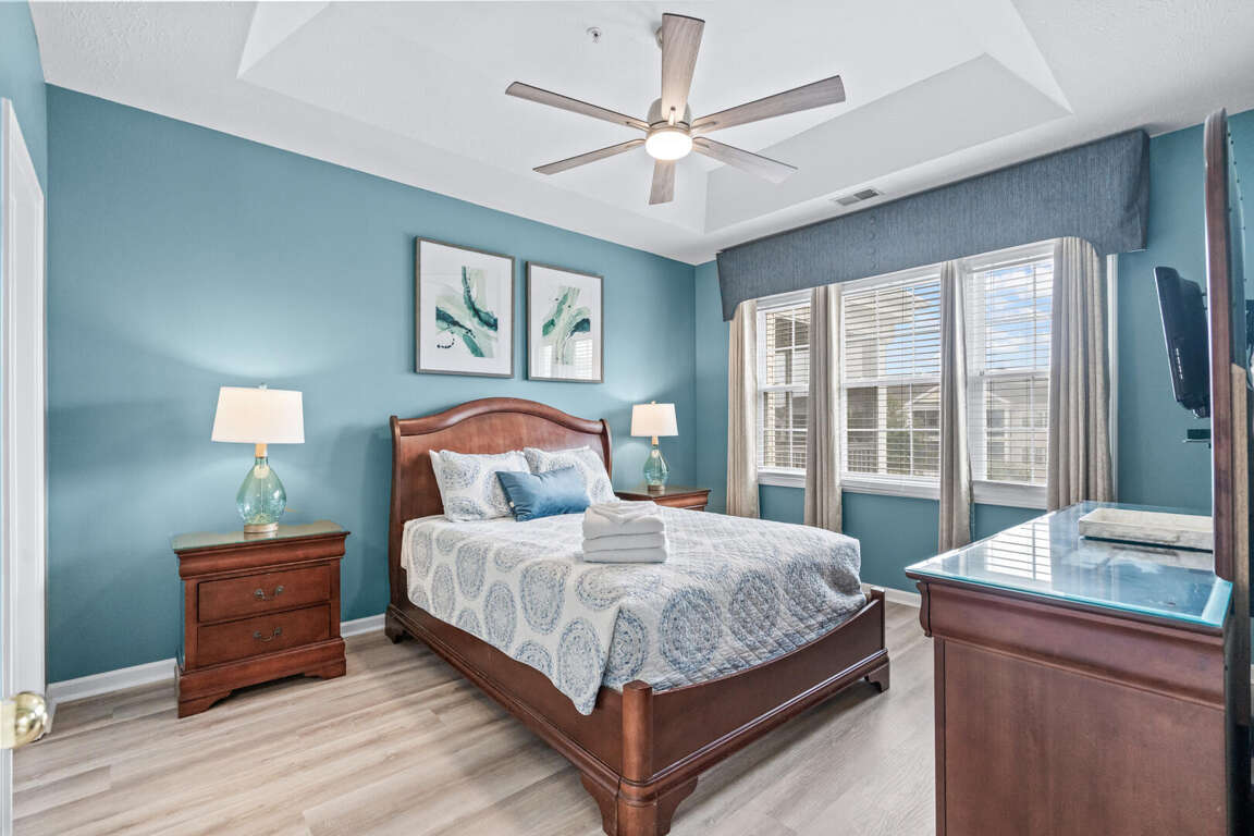 Ocean Keyes unit 3035 has a queen bed in the master bedroom, TV, and master bath with tub and shower combination. The second bedroom has a queen bed and TV. The second bath has a shower stall. The condo is equipped with a full kitchen, a living area (with a queen sleeper sofa and TV), dining area, washer and dryer, WIFI, and a relaxing screened porch with a pool view.