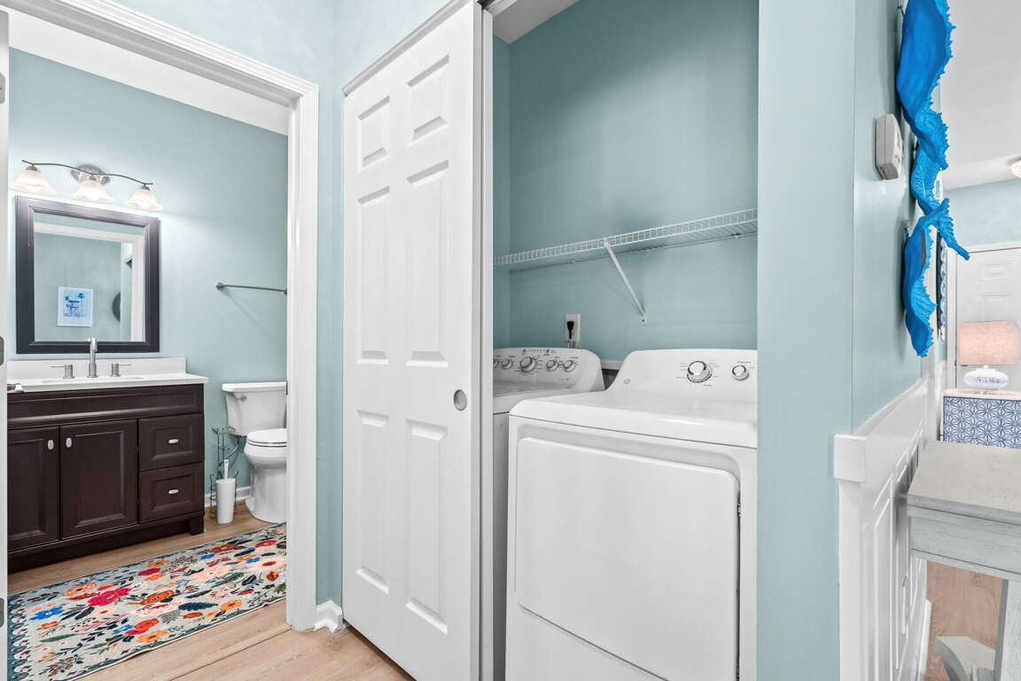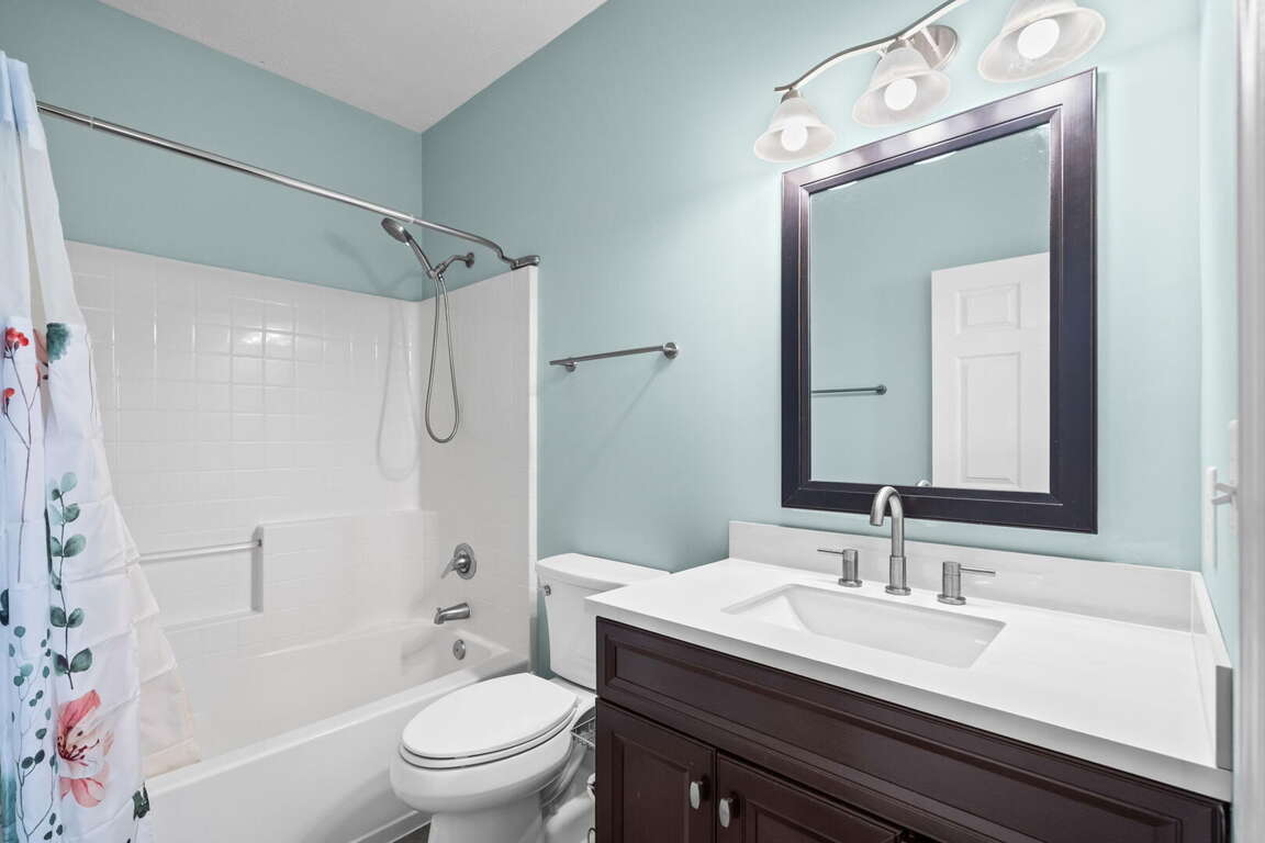 Ocean Keyes 1732 features a master bedroom with a queen bed, TV, and a private bathroom with a tub and shower combination. The second bedroom offers two twin beds and a TV. The second bathroom has a shower stall. The condo is fully equipped with a complete kitchen, living area with TV, dining area, washer and dryer, free WiFi, and a screened porch, perfect for relaxing after a day at the beach.