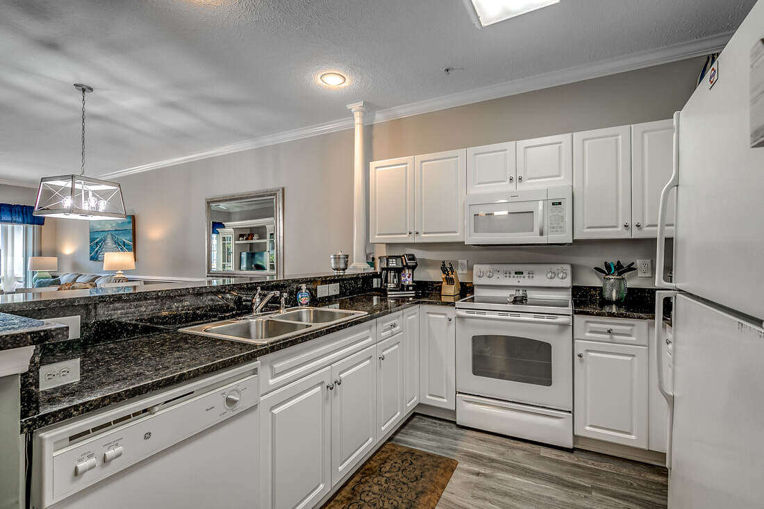 The KITCHEN has full size refrigerator, dishwasher, microwave, electric stove, a large stainless steel double sink, and granite countertops.