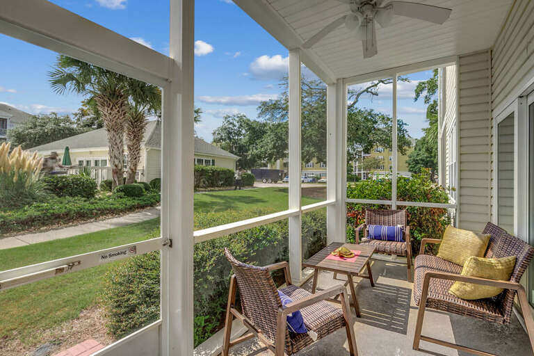 The SCREENED IN PORCH has a loveseat and conversation chairs, plus two Adirondack chairs to enjoy the view of the community and pool.
