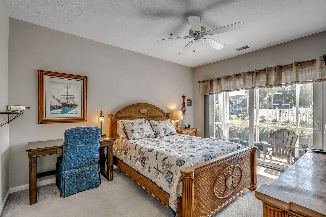 The Primary NAUTICAL BEDROOM has a Queen bed, double dresser, walk in closet, 42 inch Smart TV, computer desk with electric and USB power ports, a private full bathroom, and sliding glass patio door with views of a community pool.
