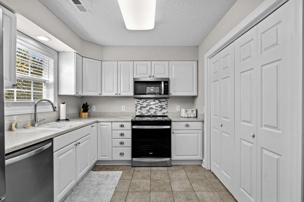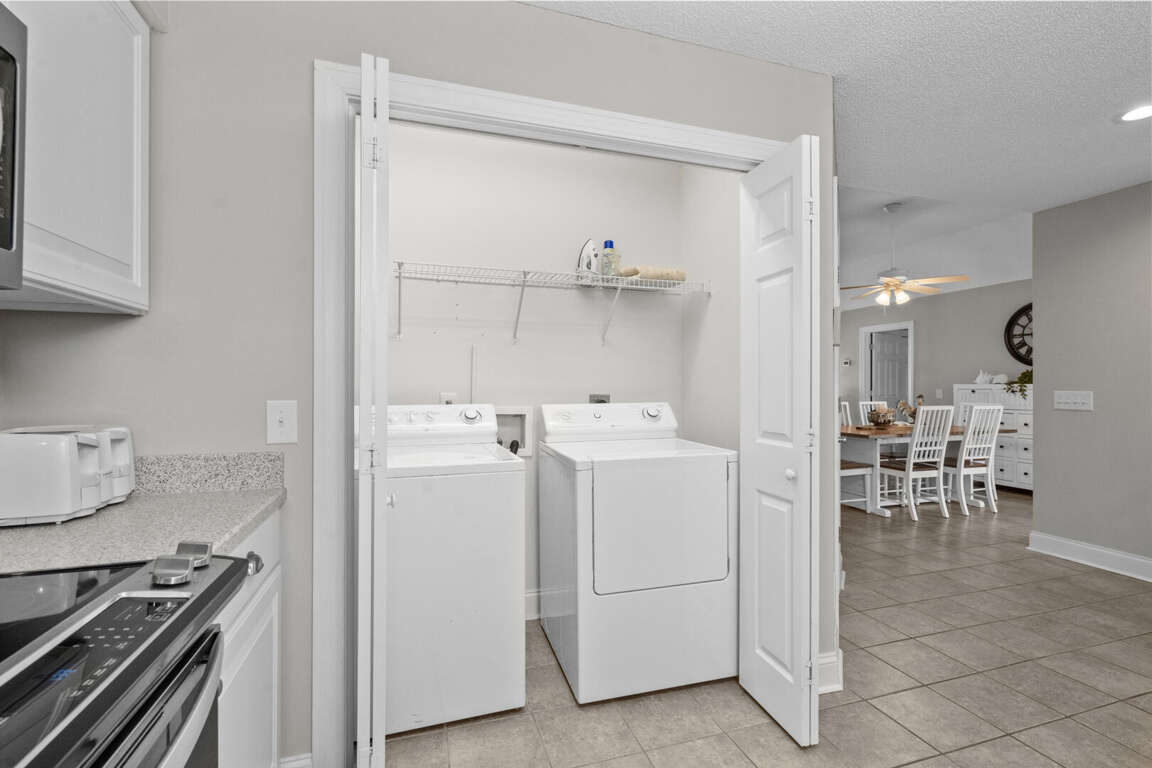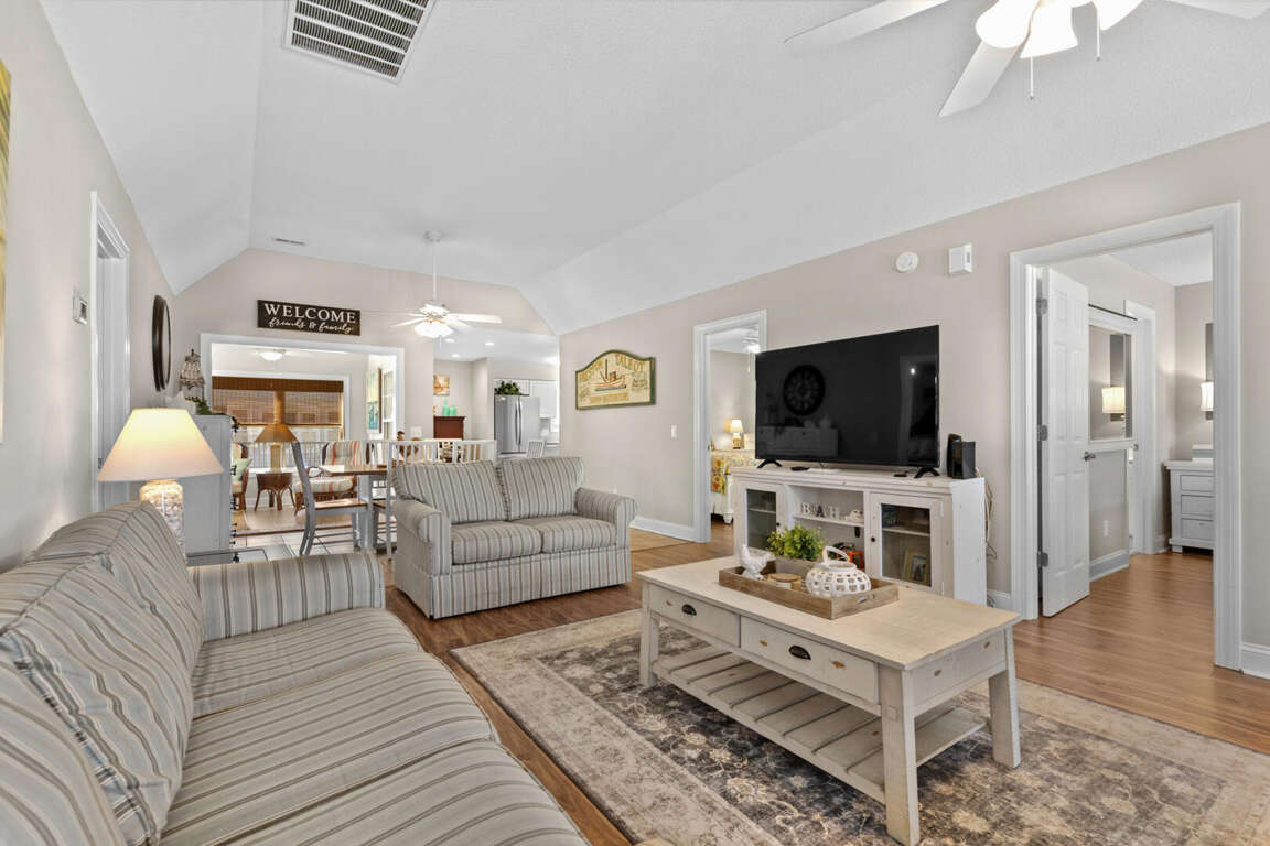 This spacious home has a master bedroom with a king bed, TV, and master bath with a tub and shower combination. The 2nd bedroom has a king bed, TV, and private bath with a walk-in shower. A king bed is in the 3rd bedroom and a queen bed is in the 4th. Each of those bedrooms has a TV and share a jack-and-jill bathroom with a tub and shower combination. There is a dining area with a table and chairs and a table and chairs in the fully equipped kitchen. There is a TV and queen sleeper sofa in the living area. This home also has a washer and dryer.