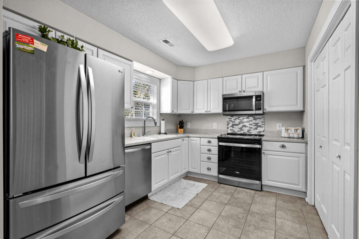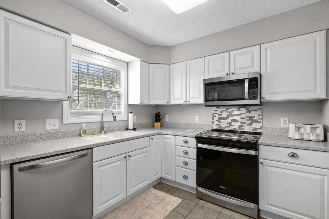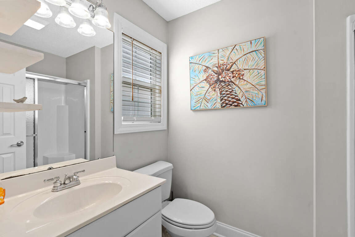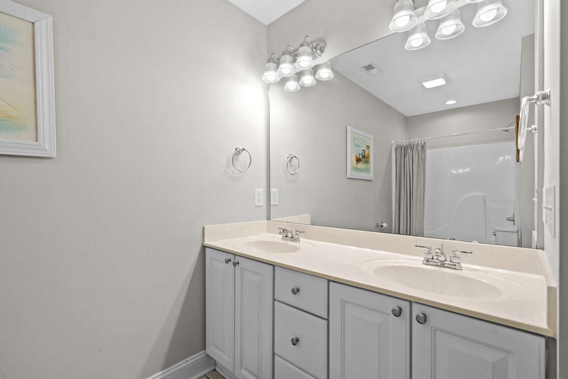 This spacious home has a master bedroom with a king bed, TV, and master bath with a tub and shower combination. The 2nd bedroom has a king bed, TV, and private bath with a walk-in shower. A king bed is in the 3rd bedroom and a queen bed is in the 4th. Each of those bedrooms has a TV and share a jack-and-jill bathroom with a tub and shower combination. There is a dining area with a table and chairs and a table and chairs in the fully equipped kitchen. There is a TV and queen sleeper sofa in the living area. This home also has a washer and dryer.