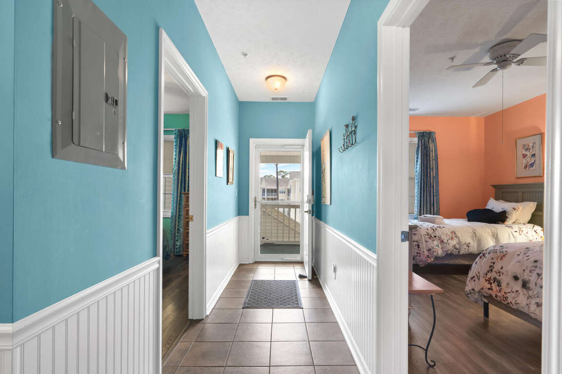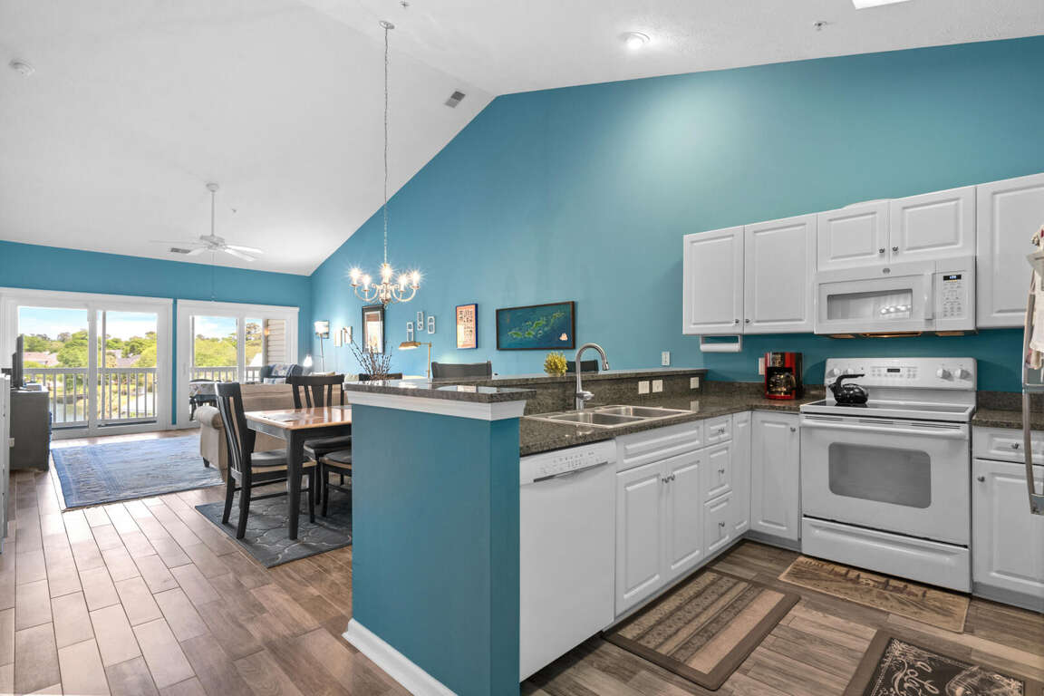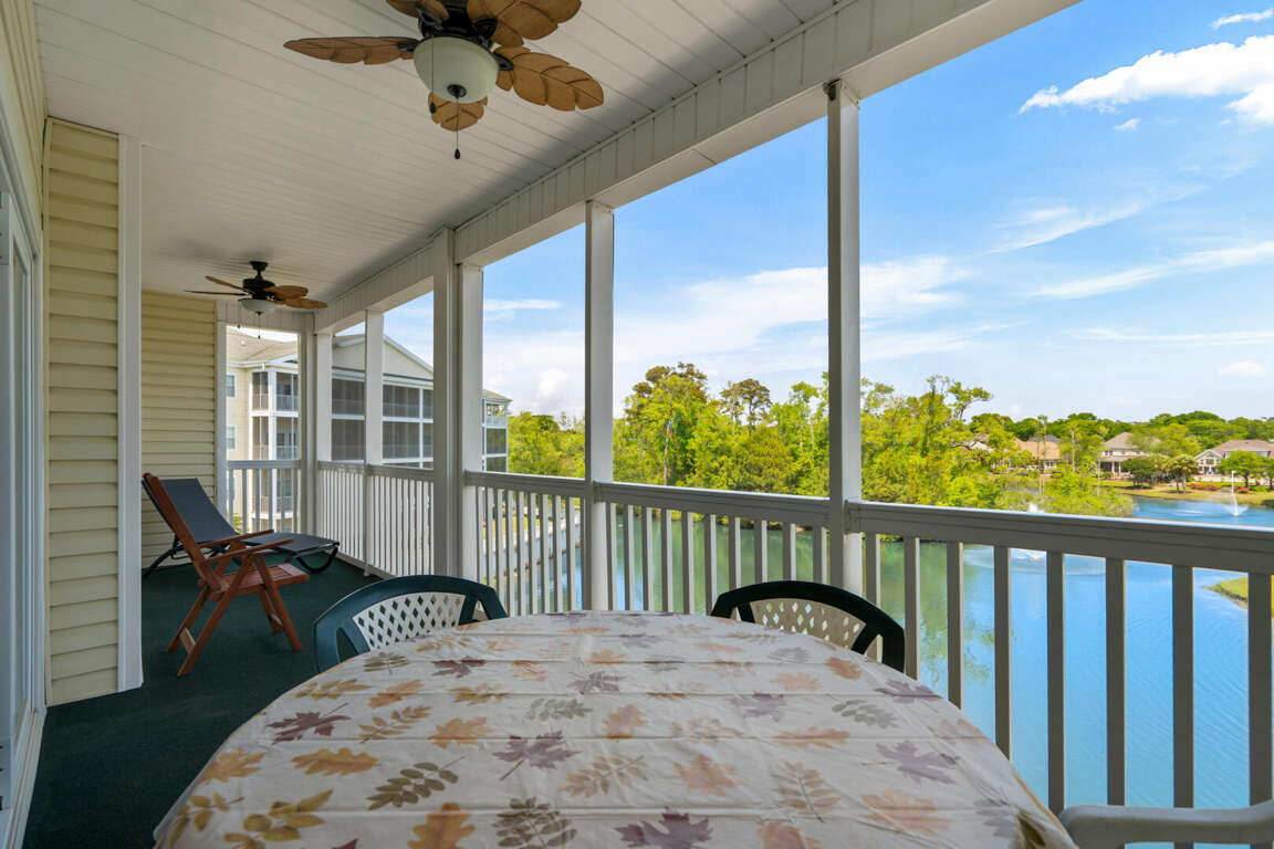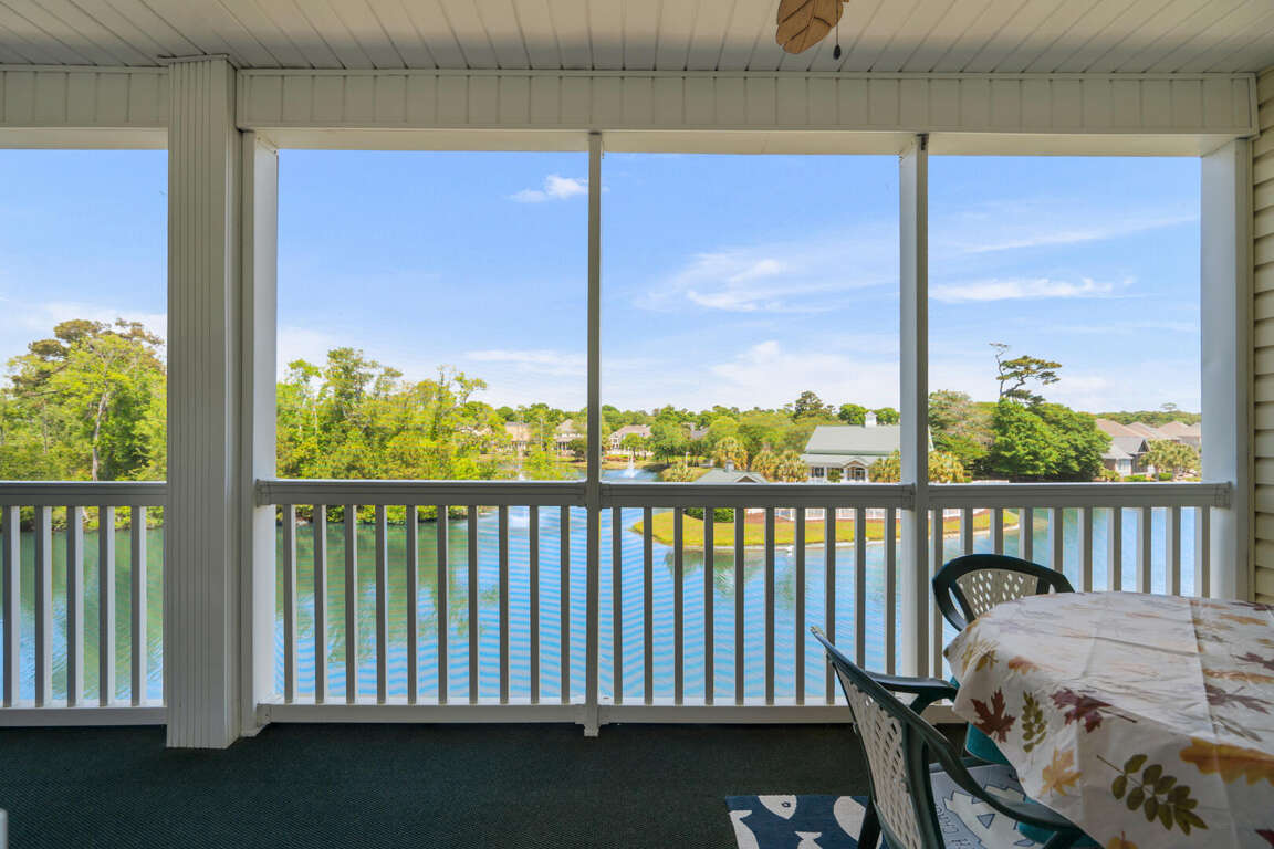 Ocean Keyes 3734 is located in the popular gated community of Ocean Keyes in the Ocean Drive section of North Myrtle Beach. This 3 bedroom 2 bath condo is on the 3rd floor, has an elevator, sleeps 6, and has a lake view from the screened porch. This condo has a master bedroom with a king bed, TV, balcony access, and a master bath with a tub and shower combination. The second bedroom has a double bed and TV. The third bedroom has 2 twin beds and TV. The second bathroom is located in the hallway with access also from the twin bedroom. This bathroom has a shower stall. Unit 3734 has a fully equipped kitchen, dining area with a table for six and two bar stools at the kitchen bar. This rental also comes with a washer/dryer and free WiFi.