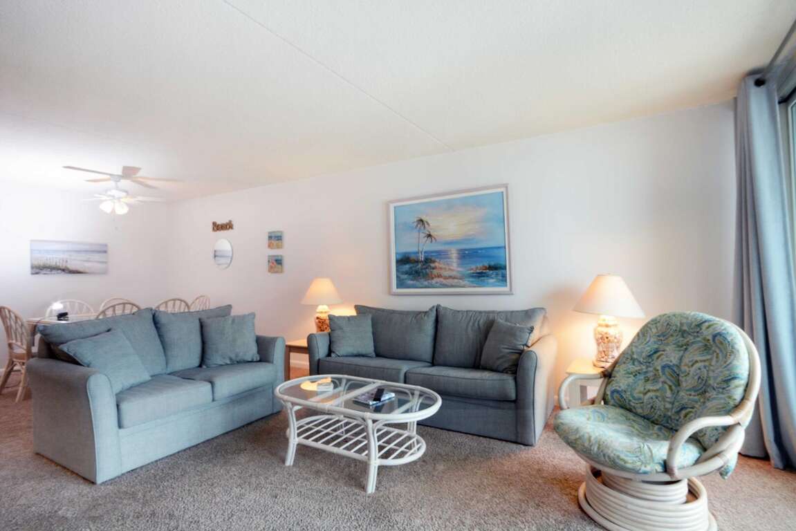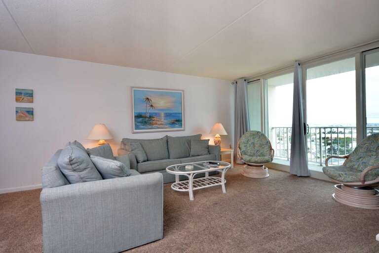 Condo with two bedrooms in a beautiful oceanfront building. Quay 11103 is a beautiful condominium located on the beachfront. The condo has a furnished balcony with views of the bay. This unit is ideal for your family to call home during a week. Quay 1103 is Ocean City’s most sought-after vacation rental. Quay 1103 has all-new furniture for the 2019 summer season. It will make your vacation memorable. The floral living room includes two comfortable couches, two matching seats, and a TV. The couch can be converted to a queen-size sleeper sofa. The sliding balcony doors let in lots of natural light, brightening the space. The living room has a small dining area that can be used to share meals with the entire family. The fully-stocked kitchen can be found next to the dining room. The kitchen also features a breakfast bar, which can be used to make quick meals. The master bedroom has a king-size bed, a private bath, and a TV. The second bedroom has a queen-size bed and a personal television. The hallway leads to the second bath. The property can accommodate up to eight people, so bring your entire family! Sizes of the beds: BR1: King, BR2: Queen, LR: Queen Sleep sofa and Queen air mattress Condo Amenities include central air conditioner and three TVs with DVD players. WiFi, cable TV, and HBO channels. Coffee maker. Building Amenities: Indoor & Outdoor Pool, Game Rooms, Tennis Courts, Shops, Saunas, Security Guards, Shops, Saunas, Security Guards. One Parking Space (provided at building with Registration Fee), Three Elevators and Outdoor Foot Shower. This property is not suitable to pets or smoking. Shoreline Properties rents to responsible adults who are over 25 years of age. Enjoy unforgettable memories with your family at The Quay!