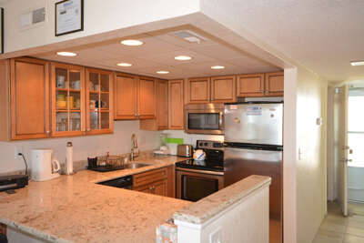 Wake up to stunning oceanfront views and enjoy your morning coffee on the furnished balcony, soaking in the serene atmosphere. The fully-stocked kitchen with a large granite countertop provides ample space for preparing meals and snacks, making dining in a breeze. Whether you're admiring the sea from the balcony or whipping up a delicious meal, the features and amenities at Even Keel 301 are designed to enhance your vacation experience.