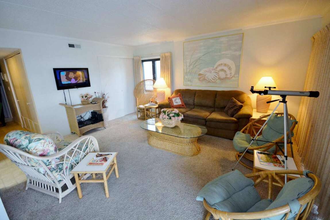 Discover the exquisite interior design highlights of this luxurious 2-bedroom condo located at 2 80th Street in Ocean City, Maryland, where coastal-inspired decor meets modern comfort for a truly memorable vacation experience. Step into a world of coastal elegance as stylish furnishings adorn the living spaces, creating a harmonious blend of relaxation and sophistication. The living room boasts a plush couch, inviting lounge chairs, and a flat-screen TV, perfect for unwinding after a day of beach activities. Natural light floods the space, accentuating the coastal-inspired decor throughout. Enjoy family meals in the charming dining area, or whip up culinary delights in the fully-equipped kitchen with a convenient breakfast bar. The master bedroom offers a queen-size bed, 2 bunk beds, and a private bathroom, ensuring comfort and convenience during your stay.