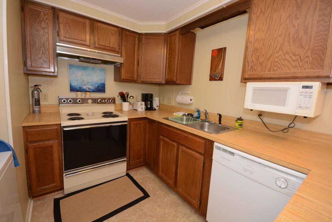 Moving from the cozy living room and dining area features, the kitchen at Old Wharf 10 Ocean City Getaway offers a fully-stocked space with a breakfast bar ideal for preparing quick or family meals. The fully equipped kitchen provides all necessary appliances for a convenient cooking experience. Whether whipping up a simple breakfast or preparing a hearty dinner, guests will find everything they need at their fingertips. The breakfast bar adds a touch of elegance to the space, offering a convenient spot for casual meals or a quick snack. Situated next to the dining area, the kitchen allows for seamless meal service and easy access for serving. Guests can enjoy the convenience and functionality of this well-equipped kitchen during their stay at Old Wharf 10.