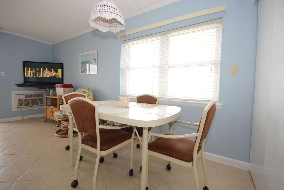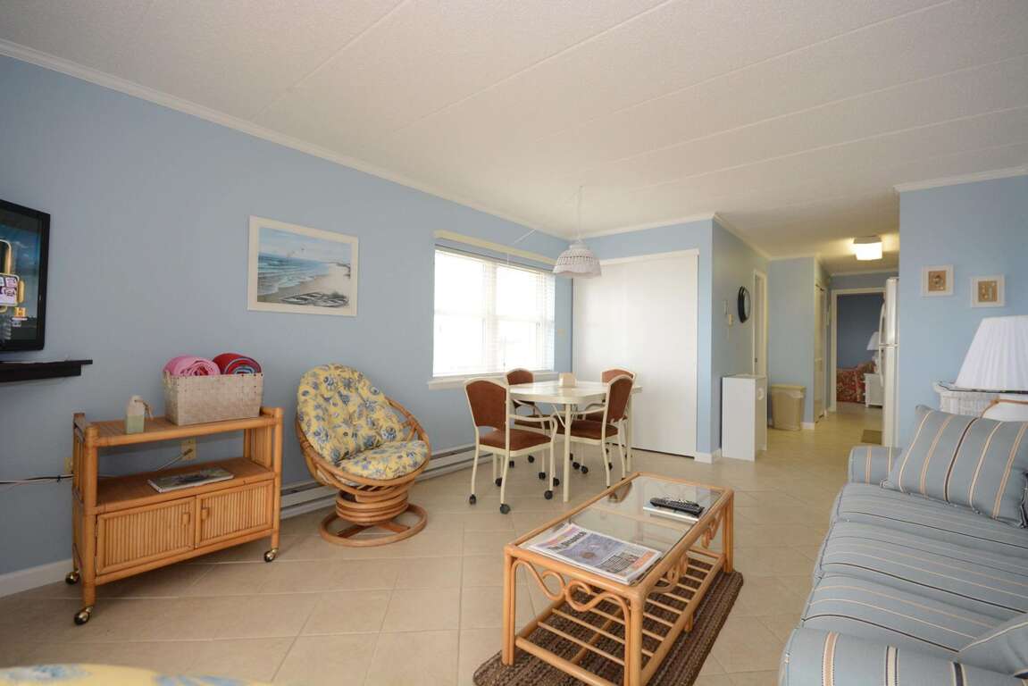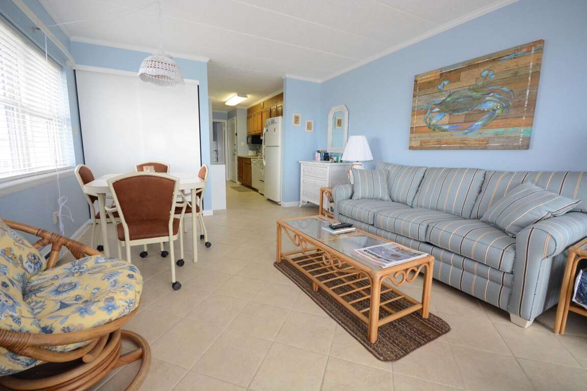 The East Winds East 301 Condo in Ocean City, MD offers a range of amenities and facilities designed to enhance the guests' comfort and convenience during their stay. The condo features a living room equipped with a TV and a queen-size sleeper sofa, providing entertainment options for relaxation after a long day at the beach. Additionally, there is a dining area perfect for family meals, and a fully-stocked kitchen with a large countertop, ideal for preparing delicious meals during your stay. The bedroom includes a comfortable queen-size bed and a private bathroom, while an additional half bathroom adds convenience. These amenities ensure a pleasant and enjoyable experience for guests looking for a beach getaway with all the comforts of home.