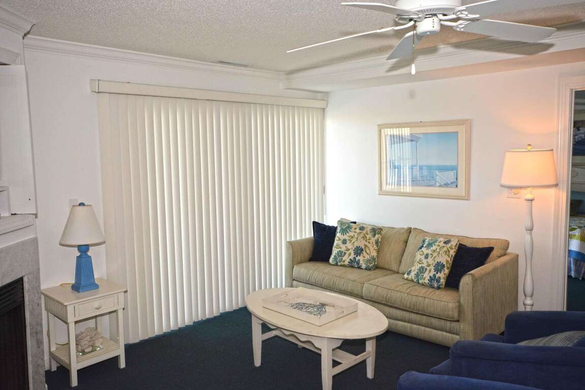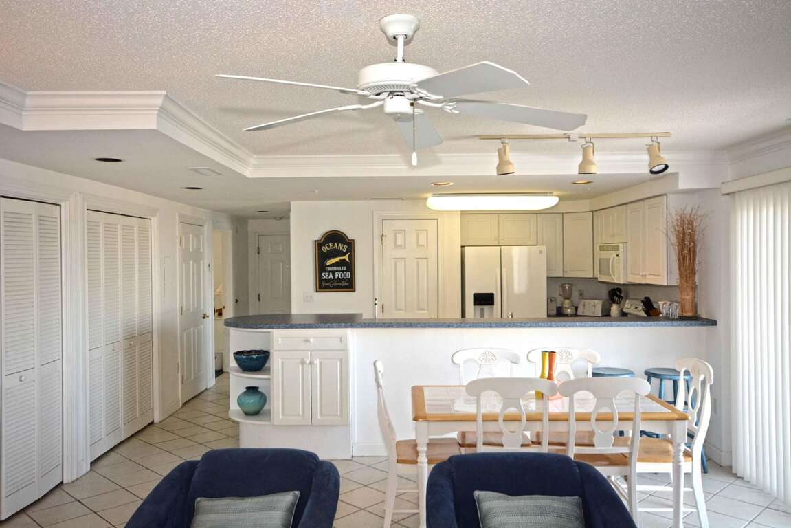 Within the luxurious 3-bedroom condo located on Coastal Hwy in Ocean City, MD, the living room and kitchen boast a blend of comfort and functionality, providing guests with a welcoming space to relax and dine during their stay. The interior design features a comfortable couch, reclining loveseat, and armchair, complemented by a TV and queen-size sleeper sofa for entertainment options. Sliding balcony doors allow natural light to fill the room, enhancing the cozy atmosphere. The small dining area offers a charming spot for meals, while the fully-equipped kitchen with a breakfast bar caters to culinary needs. This space is thoughtfully designed to ensure guests enjoy both relaxation and convenience during their stay at Lorelei 308.