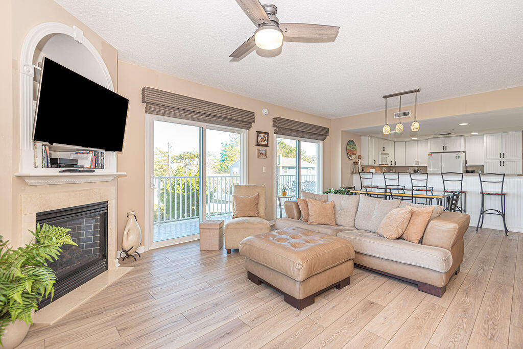 Within the modern 3-bedroom condo of Captiva Bay 105 in Midtown Ocean City, MD, guests will discover a tastefully furnished interior boasting a range of amenities for a comfortable and enjoyable stay. The decor styles in the condo are chic and contemporary, with a touch of coastal charm that complements the beachside location. The furniture arrangement is thoughtfully done, providing ample seating in the living room with plush leather couches, a cozy fireplace, and a ceiling fan for added comfort. Natural lighting floods the space through sliding doors, creating a bright and airy ambiance. The dining room is perfect for family meals, and the spacious, well-equipped kitchen caters to all culinary needs, ensuring a delightful vacation experience.