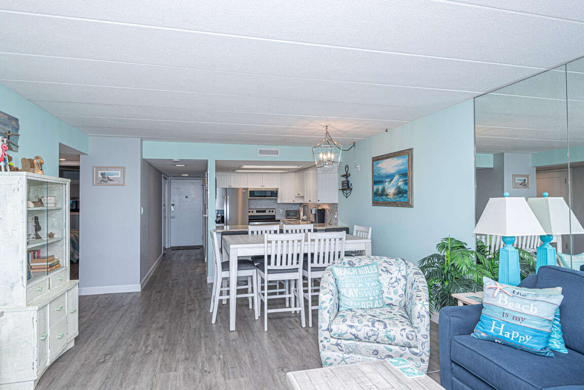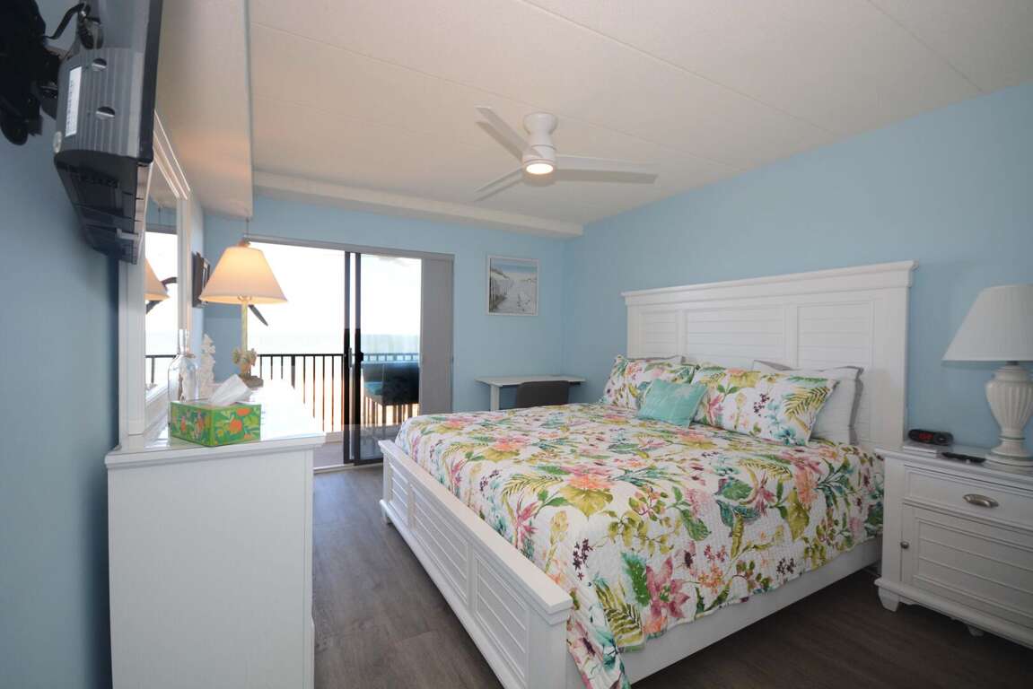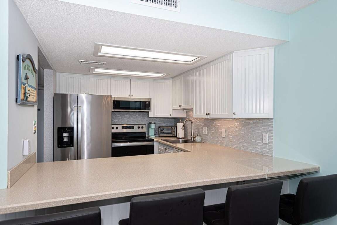 Enhance your coastal retreat experience with the sophisticated interior features of the Mariner I 3M condo, including an oceanfront balcony with outdoor furniture where you can enjoy stunning oceanfront views. The brand new kitchen is equipped with stainless steel appliances, perfect for preparing meals while enjoying the coastal decor. The spacious open concept family room and dining area provide a comfortable and inviting space for relaxation. The master bedroom offers breathtaking ocean views and includes an en-suite bathroom for added convenience. The second bedroom features a cozy bunk bed and a queen bed, ensuring a restful night's sleep after a day of beach activities. Immerse yourself in luxury and serenity with these exceptional interior features.