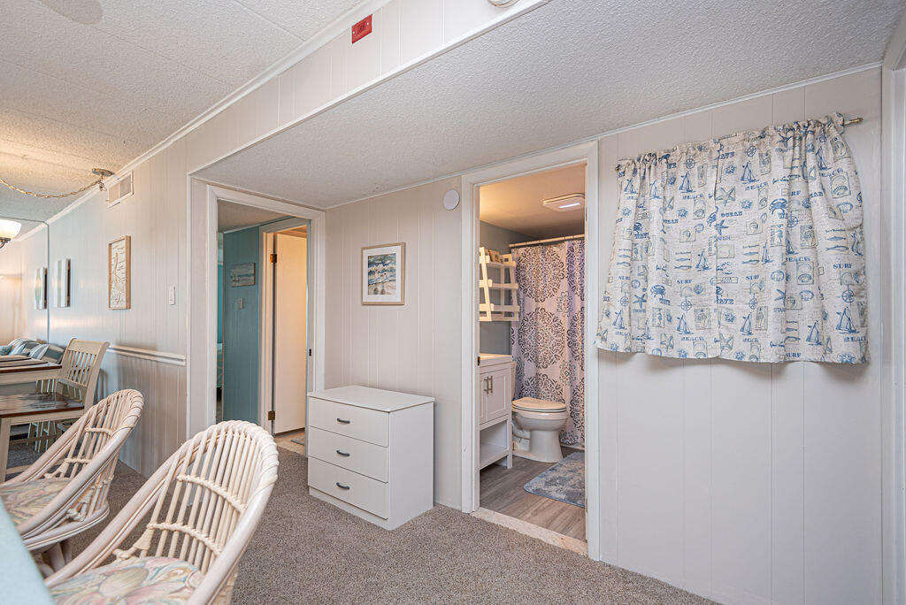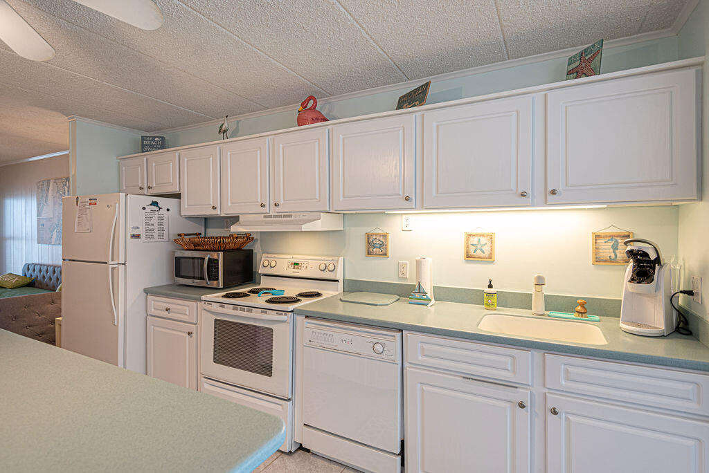 Nestled within the inviting confines of Sea Terrace 1204 in Ocean City, MD, the kitchen and dining setup epitomize modern convenience and comfort for guests seeking a seamless culinary experience. The kitchen is equipped with top-of-the-line appliances, ensuring that meal preparation is a breeze. Guests will find a stove, coffeemaker, disposal, icemaker, and ceiling fans in all rooms for added convenience. The dining room boasts elegant decor, creating a welcoming ambiance for enjoying meals with family and friends. Whether guests are whipping up a quick breakfast before hitting the beach or hosting a cozy dinner indoors, the kitchen and dining area at Sea Terrace 1204 cater to both functionality and style.