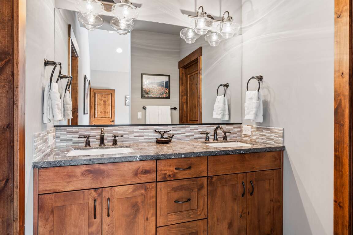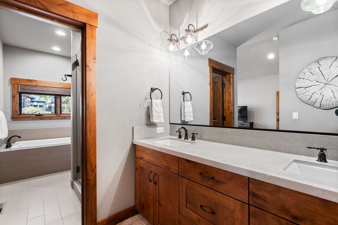 First Bedroom (First Floor): The primary suite features a king bed, 49" Smart TV and en-suite bathroom with a double vanity and a walk-in shower.