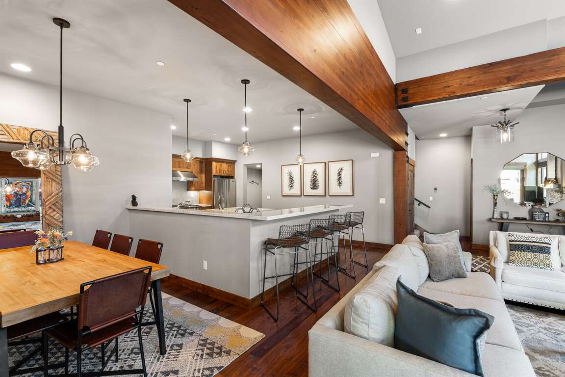 Dining Room: Seats up to 8, with additional seating for 4 at the kitchen island.