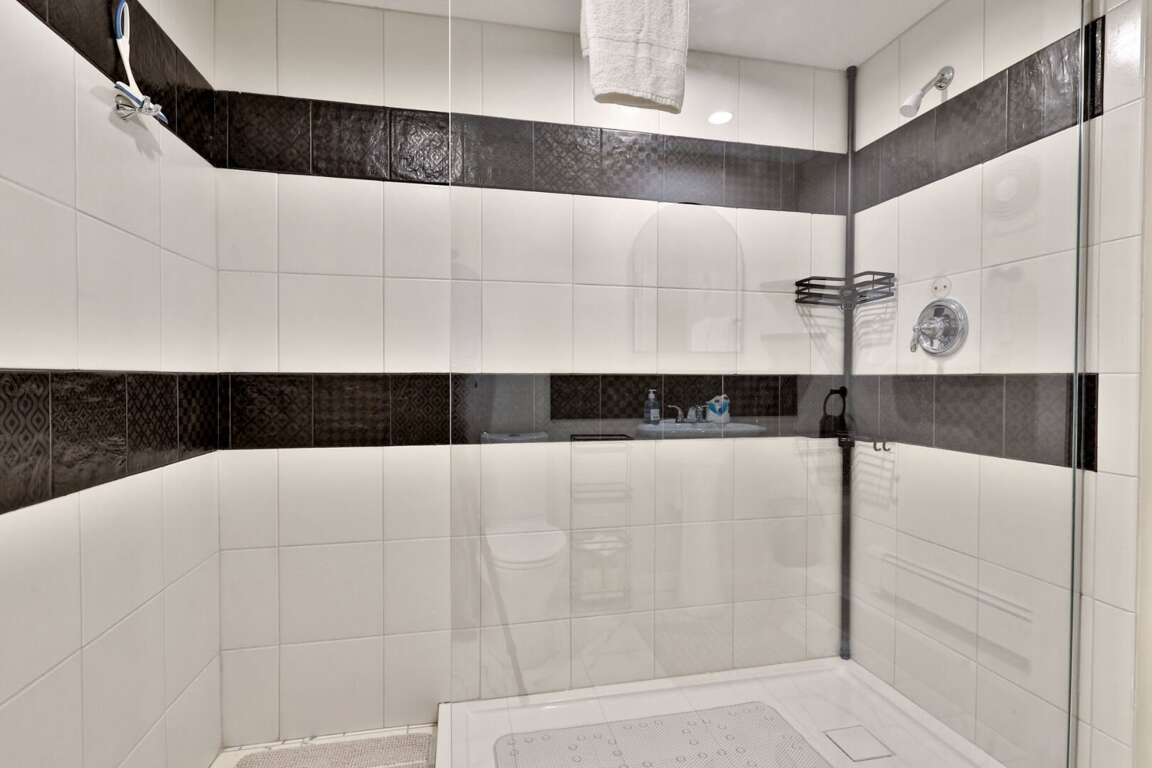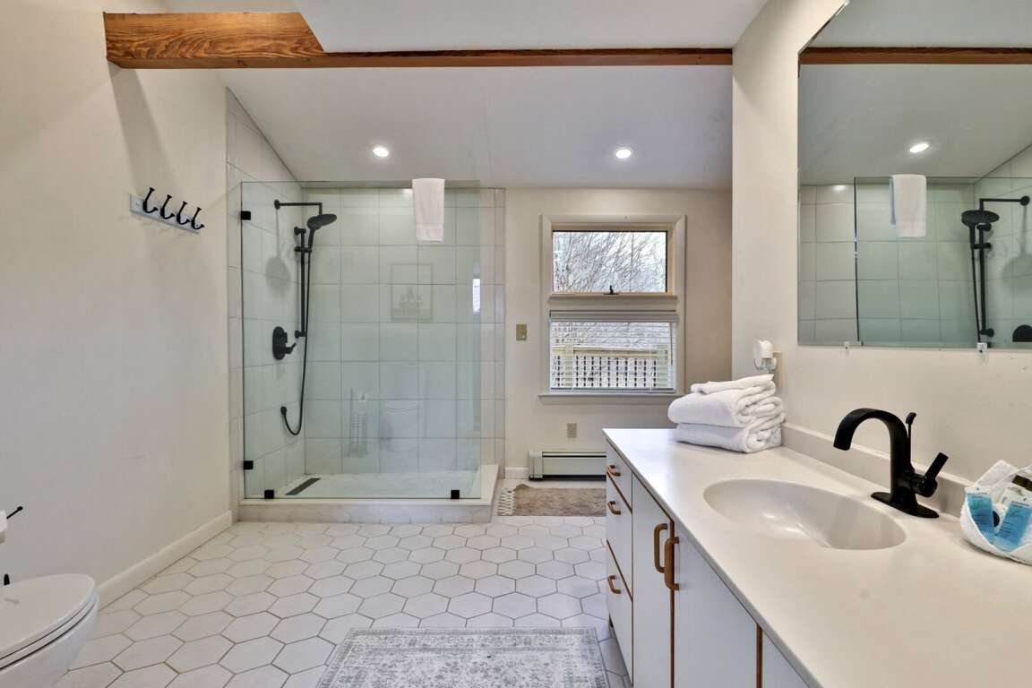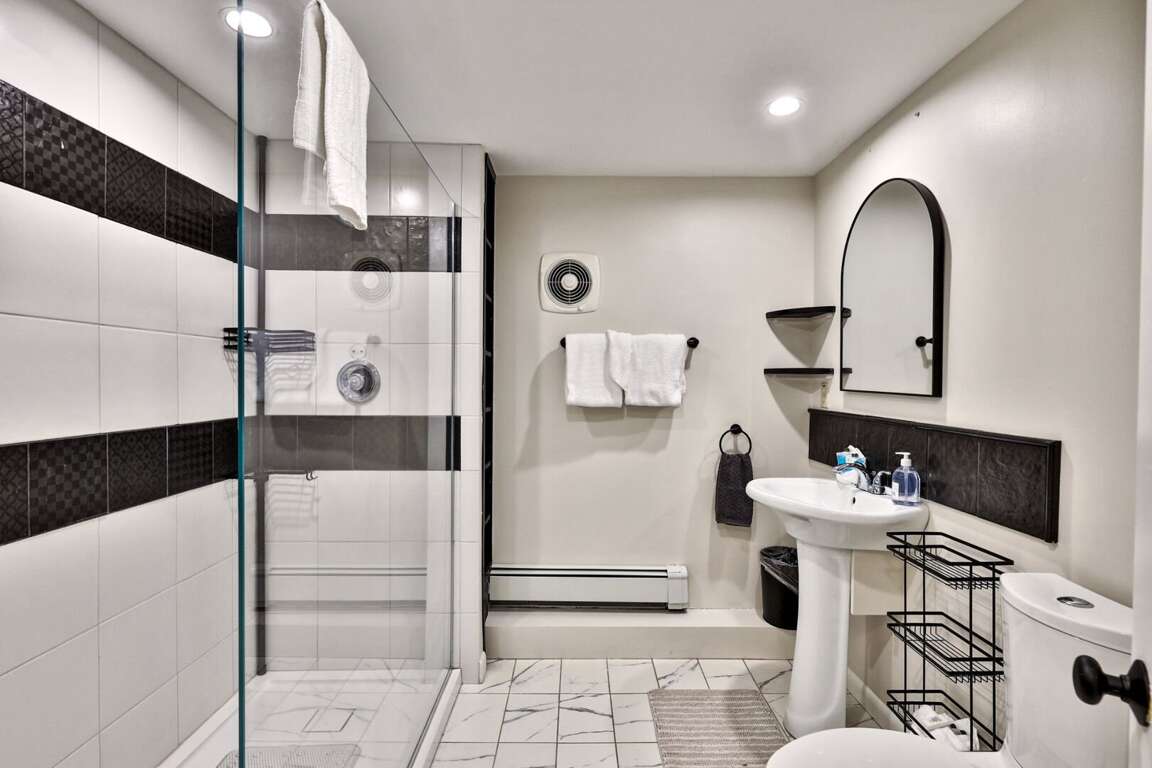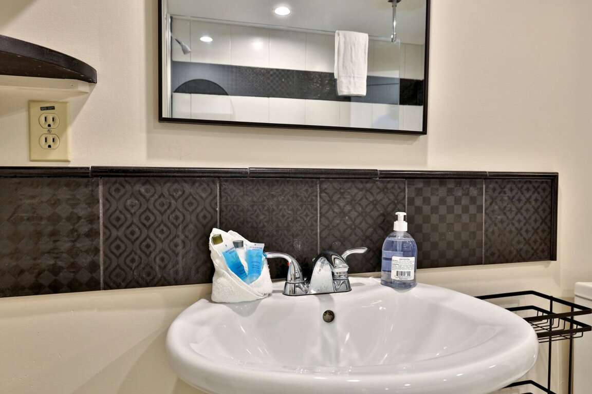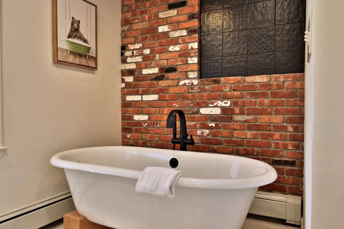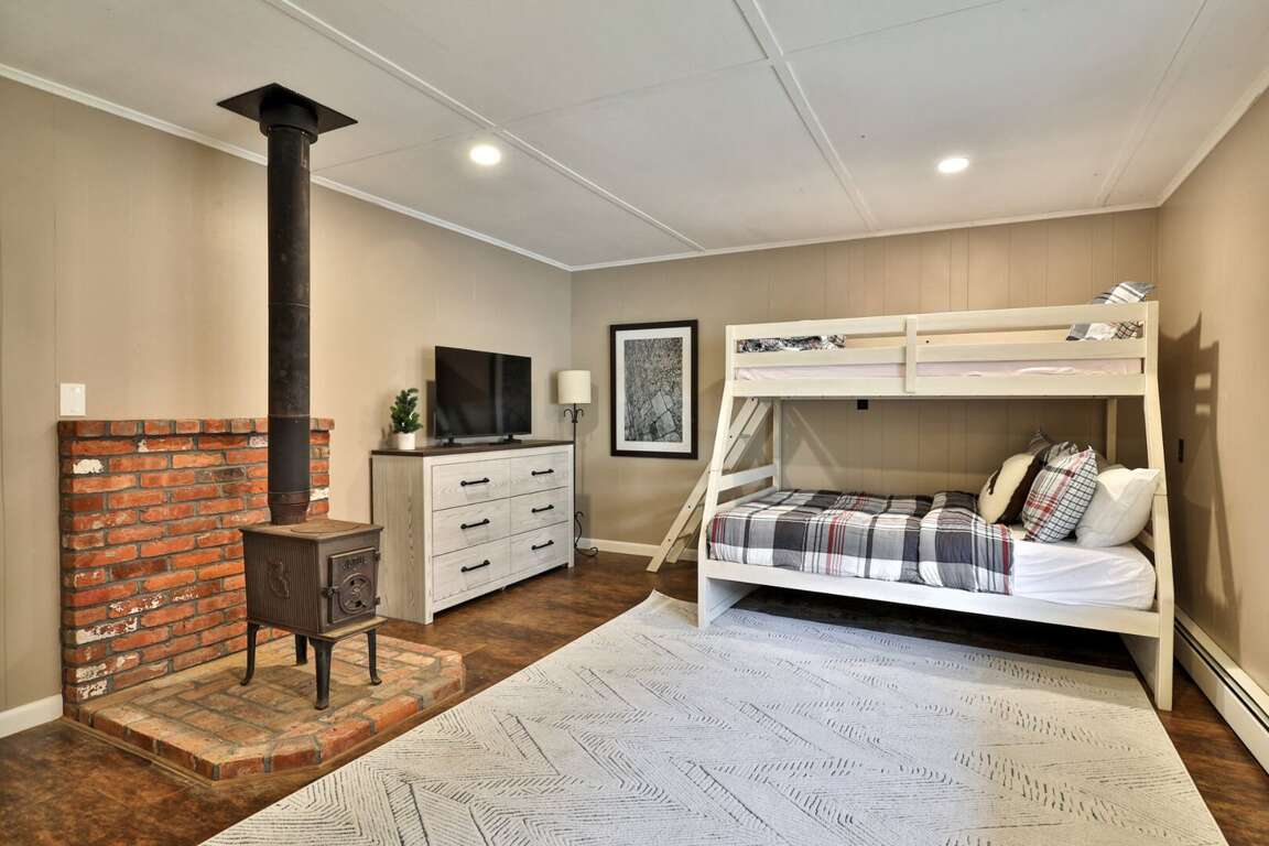 <p>The sleeping arrangements are designed for flexibility. The "Kid Kingdom" <strong>bunk room</strong> is a destination in itself, featuring a Full/Twin bunk bed, its own TV, and a wood stove. The <strong>primary bedroom</strong> offers a King bed, while a <strong>Queen bedroom</strong> and a separate <strong>Full bedroom</strong> ensure adults or teens sleep comfortably. We also have a <strong>futon</strong> in the lower common area for overflow. The bathrooms have been <strong>fully renovated</strong>. The highlight is a <strong>clawfoot soaking tub</strong> set against <strong>exposed brick</strong>, plus modern glass walk-in showers that guarantee good pressure and plenty of hot water.</p>