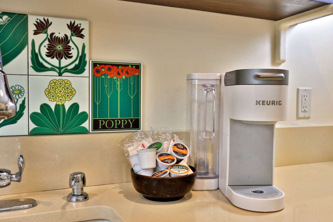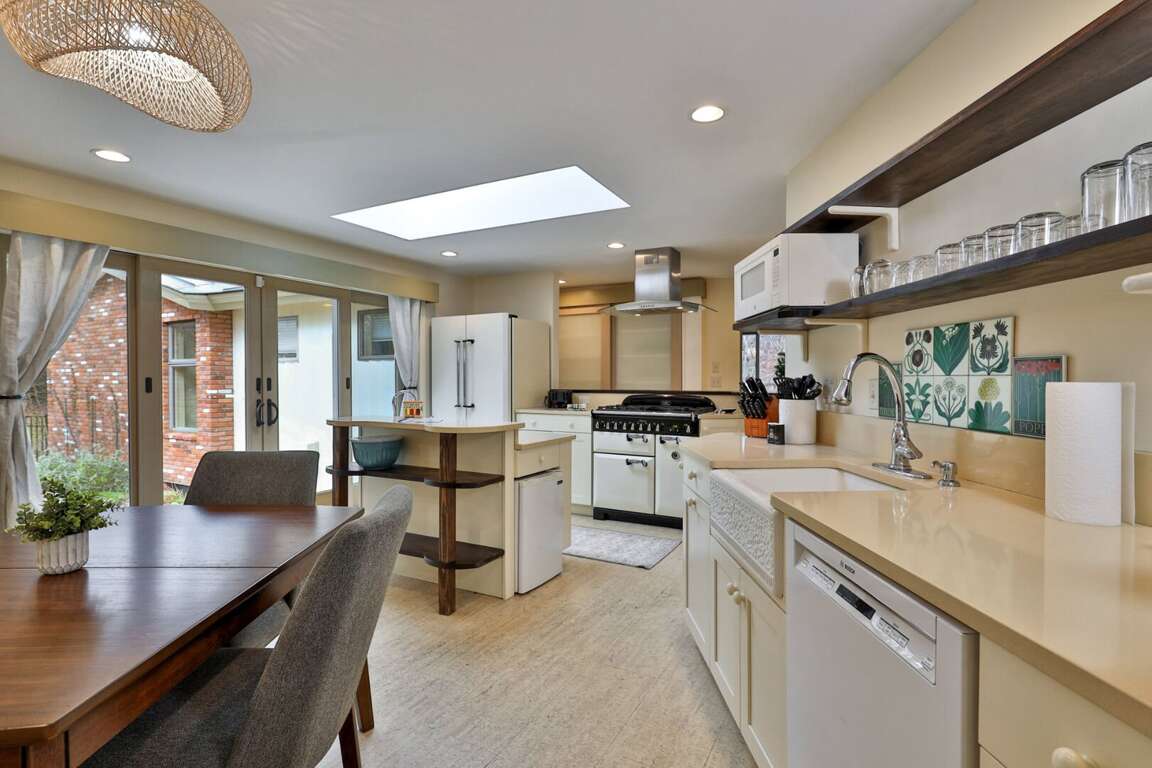 <p>Most rentals treat the kitchen as an afterthought. We built this one for people who love to cook. The centerpiece is a white enamel gas <strong>AGA-style range</strong> that handles big breakfasts and holiday dinners with ease. You have a deep farmhouse sink, a sprawling <strong>prep island</strong>, and both Keurig and drip <strong>coffee</strong> options to fuel your first tracks.</p>