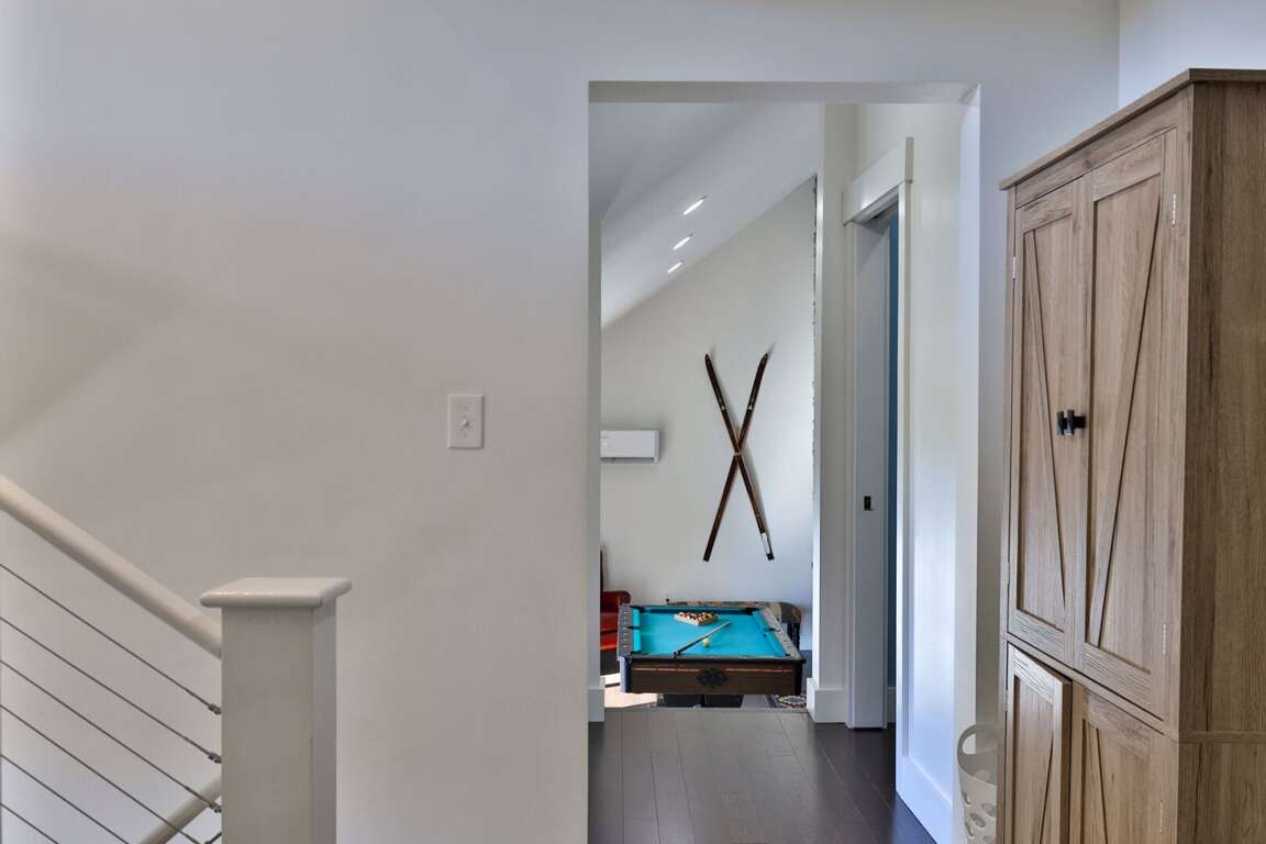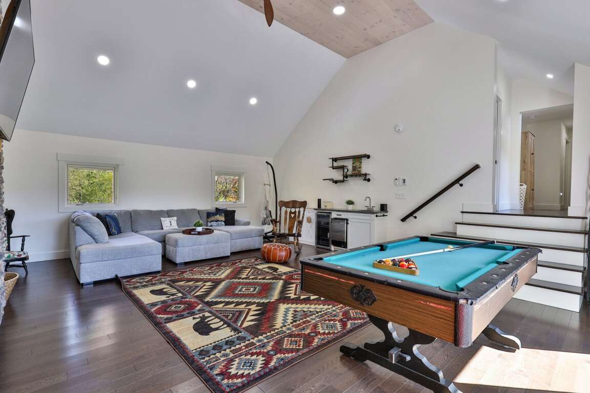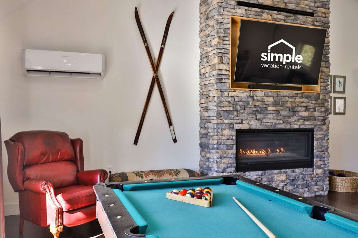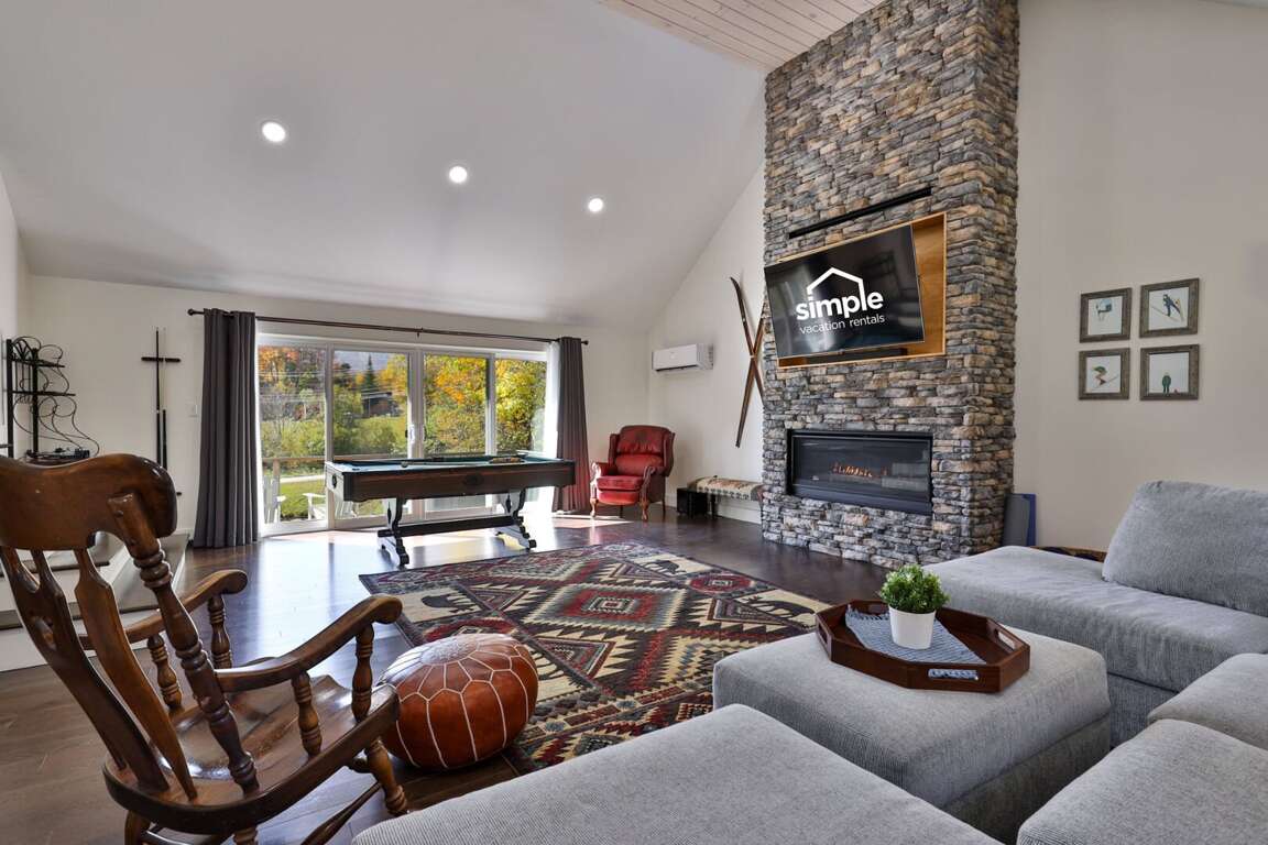 <p>The separate <strong>living room</strong> features a gas <strong>fireplace</strong>, <strong>pool table</strong>, oversized sectional, smart TV, and sliding doors to the deck and hot tub.</p>