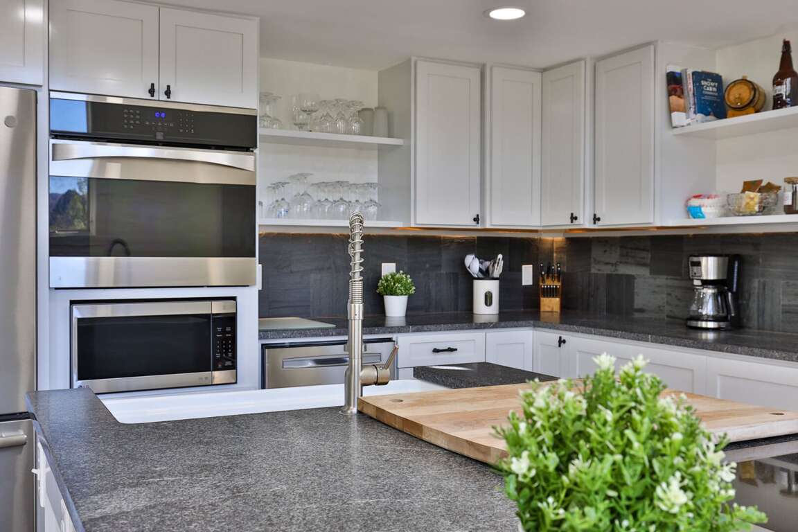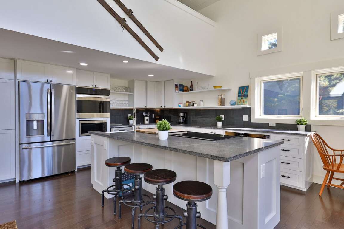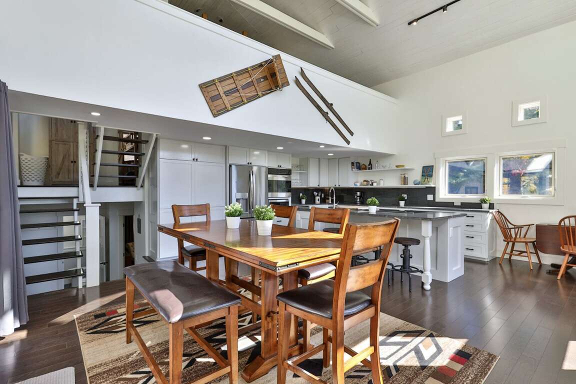 <p>The <strong>kitchen</strong> and <strong>dining</strong> area share an <strong>open space</strong> that invites group meals and conversation. The kitchen includes an induction cooktop, wall oven, microwave, and large island with seating. It flows into a spacious dining area with direct access to the deck for grilling, relaxing, or enjoying the view.</p>