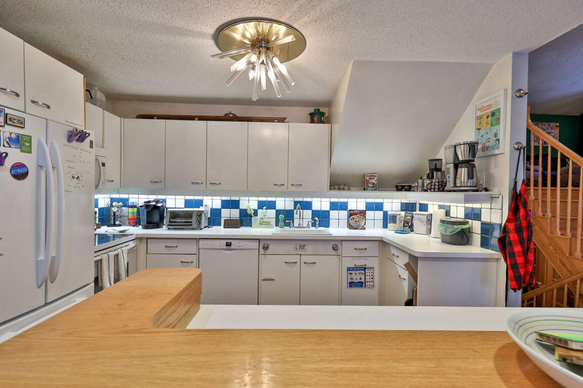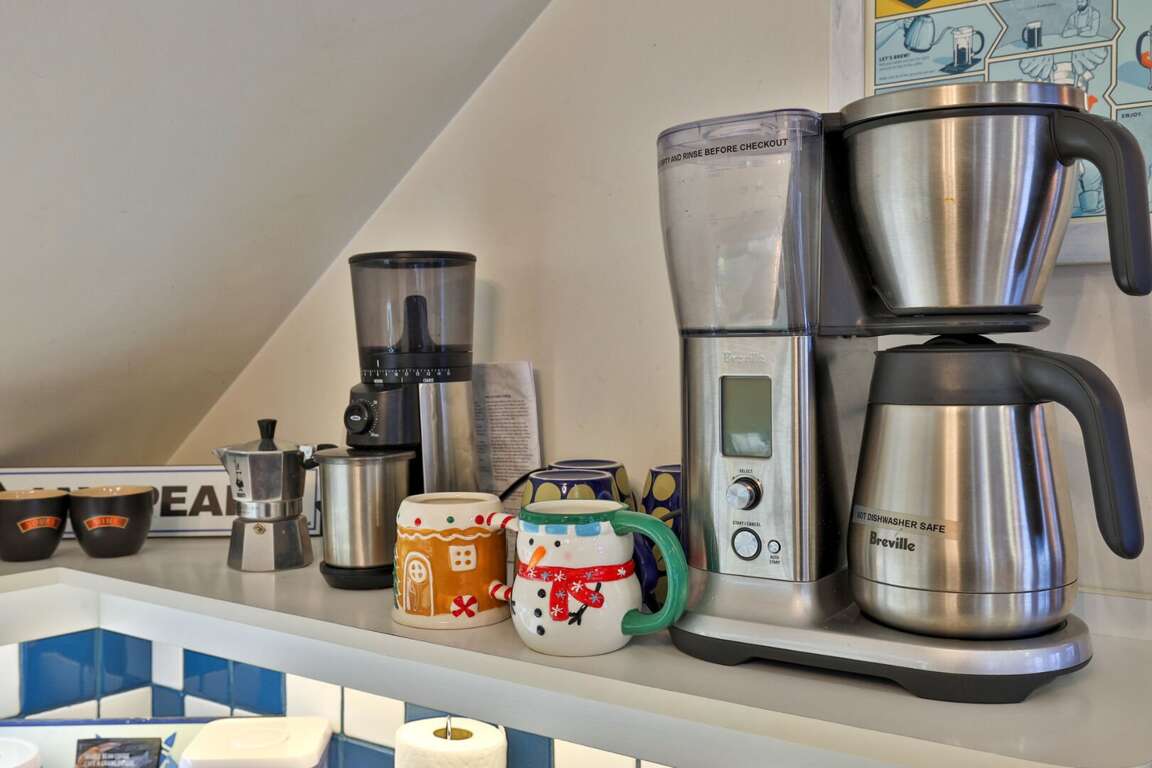<li><strong>The Chef's Quarters:</strong> Fully equipped kitchen with white cabinetry, drip coffee maker, Keurig, Moka pot, and toaster oven.</li>