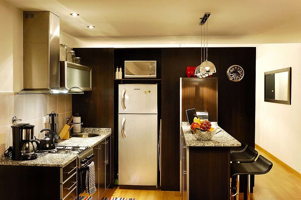 <li>Fully stocked kitchen with Samsung microwave/grill, refrigerator, gas stove, all plates, pots and pans, cutlery, cooking utensils, toaster, blender, coffee maker, wine glasses and more</li>