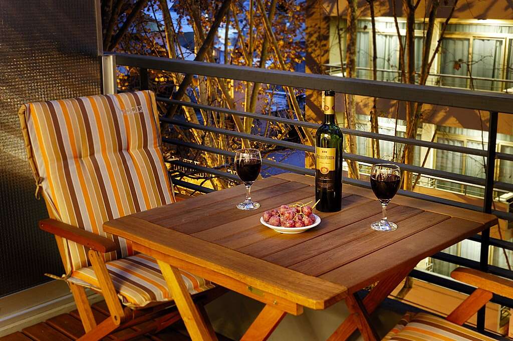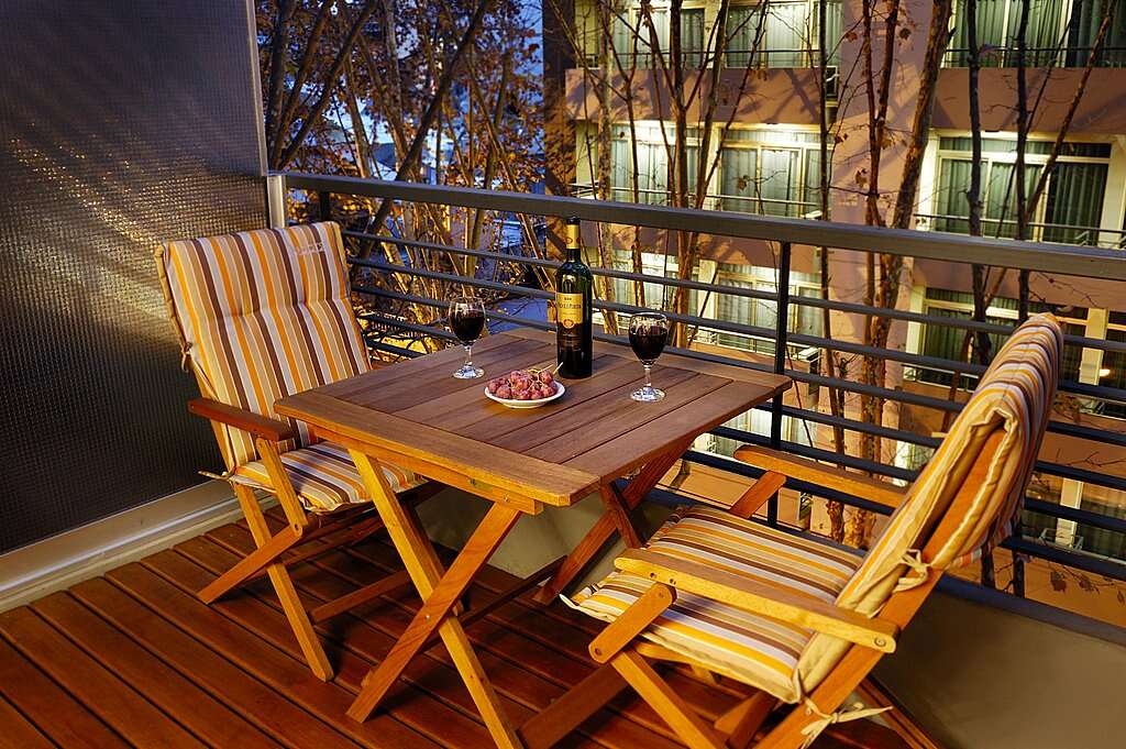 <li>Private balcony with dining table and chairs</li>