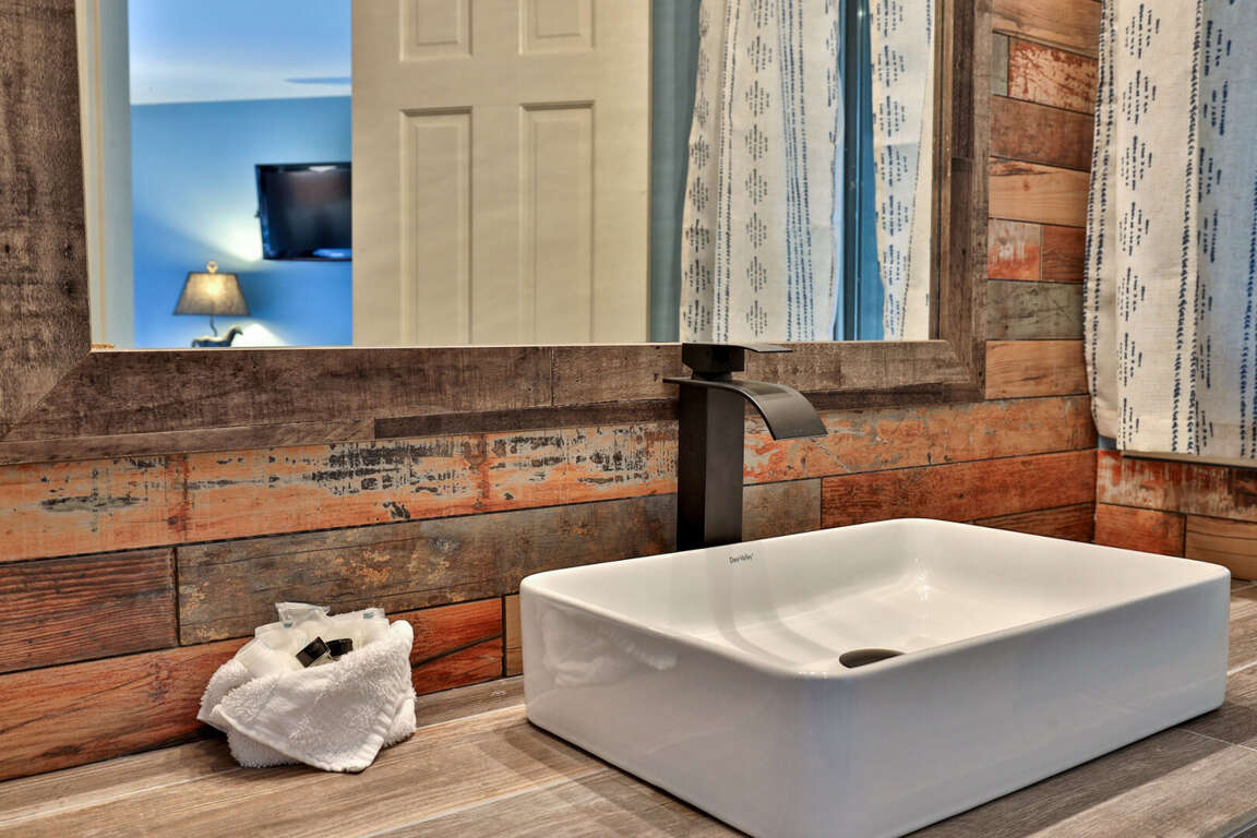 <p>The <strong>bathrooms</strong> were designed for post-ski restoration. Soak tired muscles in the deep tub or rinse off in the custom rainfall shower. Details like hammered copper sinks remind you that you are in the mountains.</p>