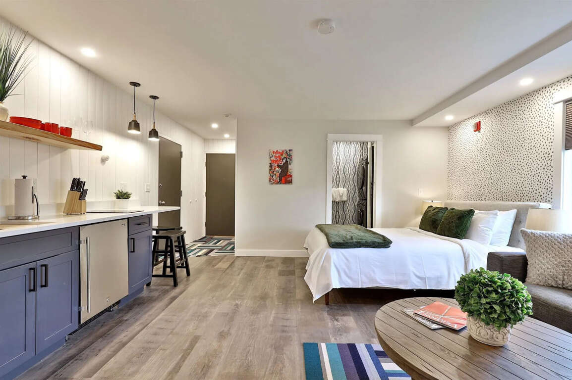 <li>Queen bed plus sleeper sofa in the same open studio space</li>