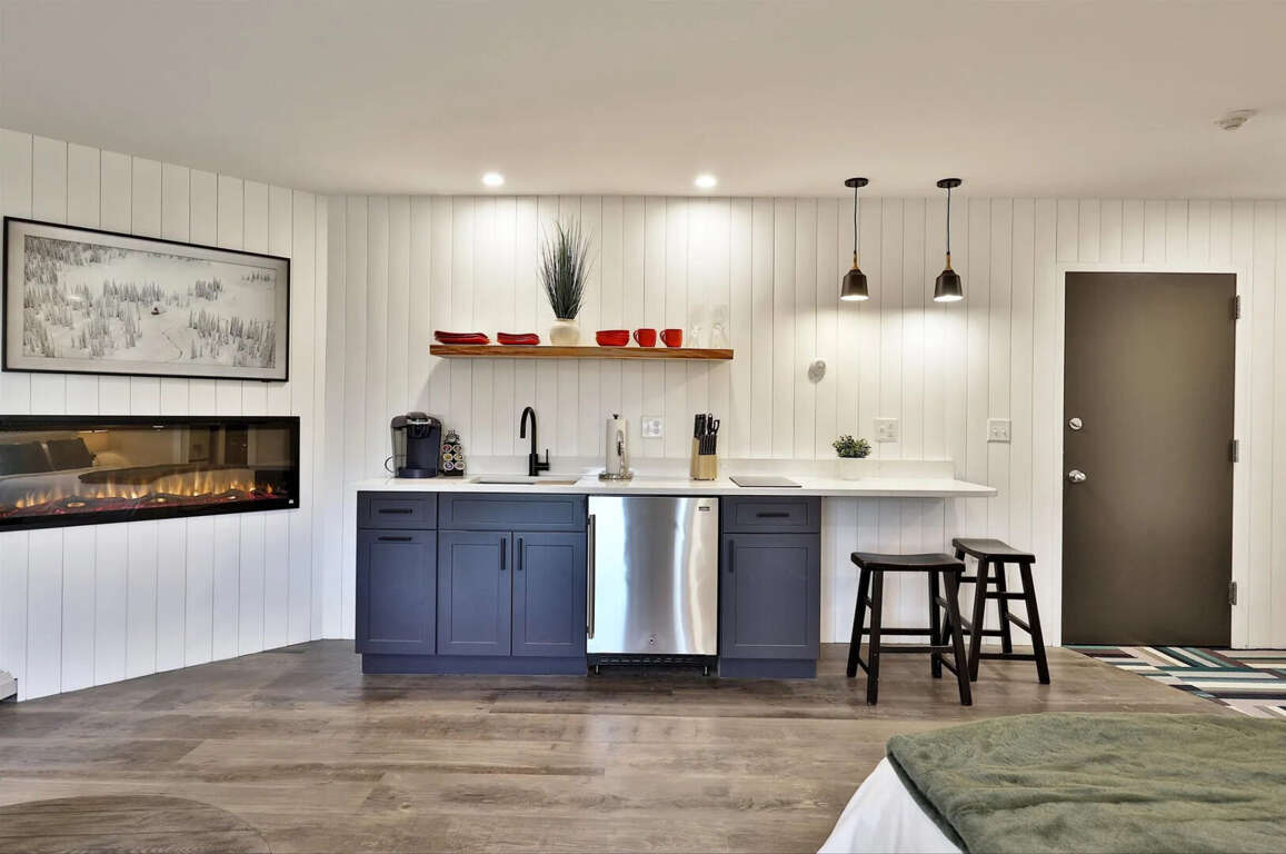 <p>This studio is designed to feel like a boutique hotel room with more control. The main area combines a comfortable queen bed, sectional sleeper sofa, and a wall-mounted electric fireplace that anchors the room. A bar-height counter with two stools doubles as a coffee spot and laptop-friendly workspace. Blackout shades help you rest between runs or after a late dinner in town.<br />