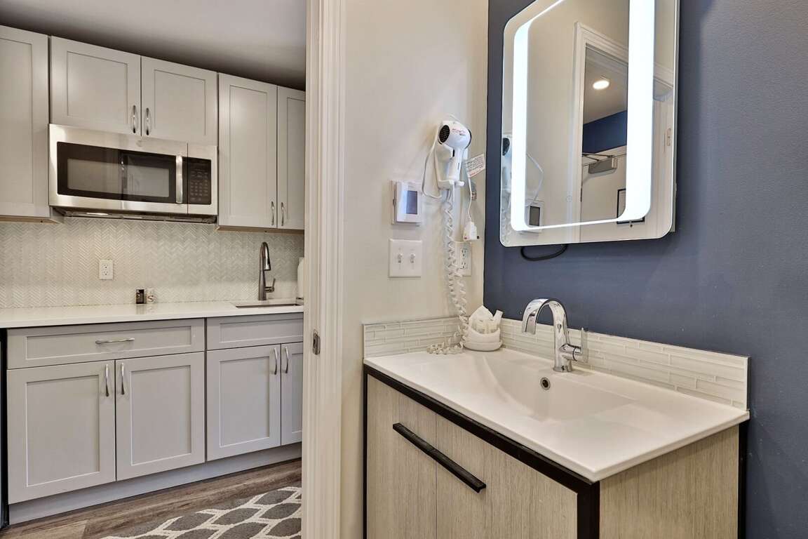 <p>The kitchenette is equipped with a microwave, mini fridge, sink, and all the essentials for preparing quick meals and snacks. Enjoy your meals at the counter-height table with seating for two.</p>