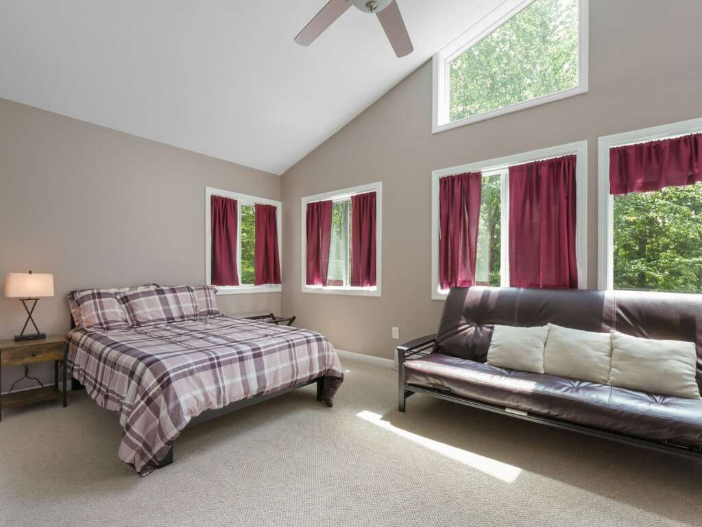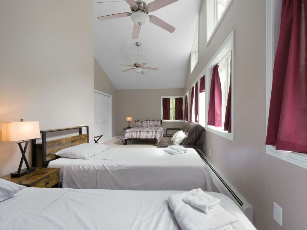 <li>Bedroom 3 (Upper Level): Double bed, futon, and two twin beds; vaulted ceiling and ensuite bathroom with jetted tub.</li>