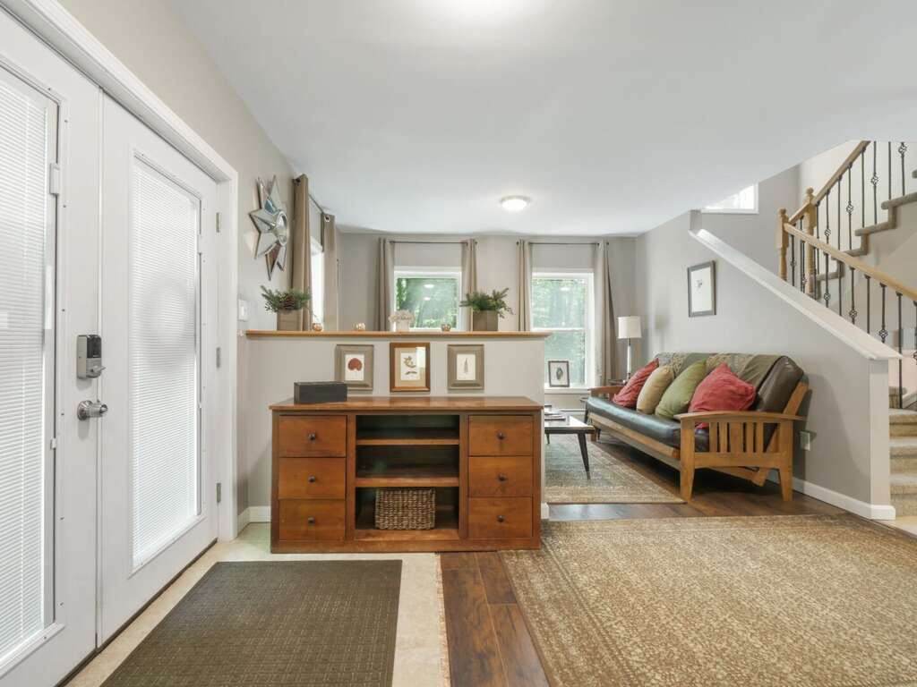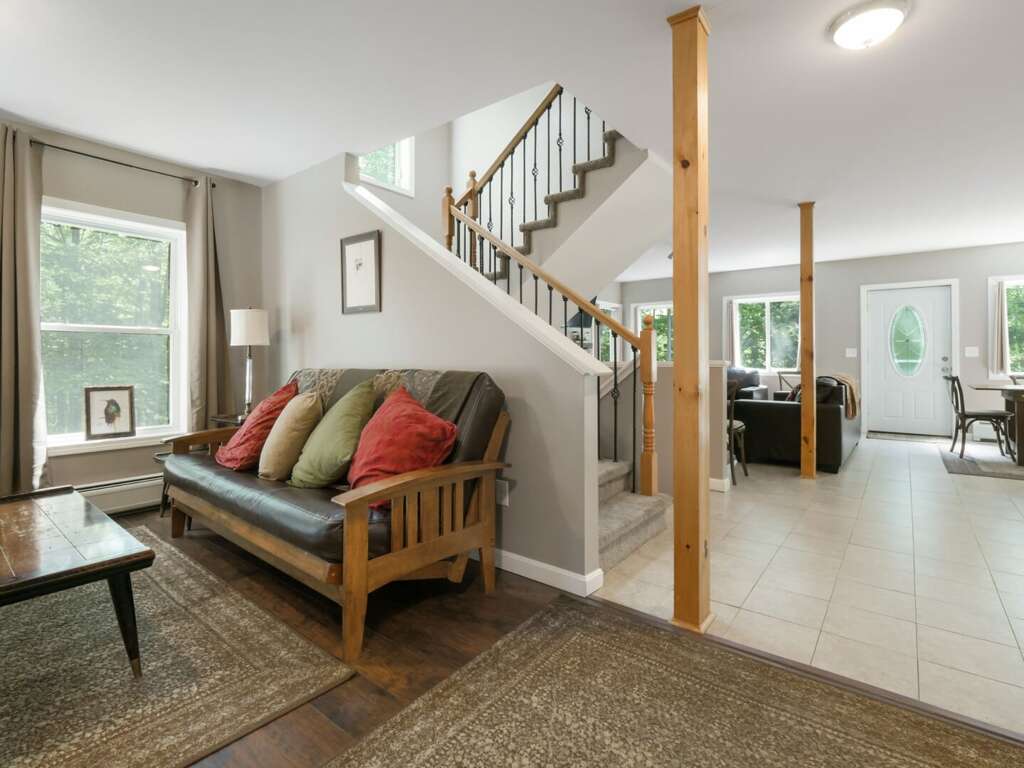 Three-story home surrounded by trees, with Vermont sunshine streaming through the many windows.