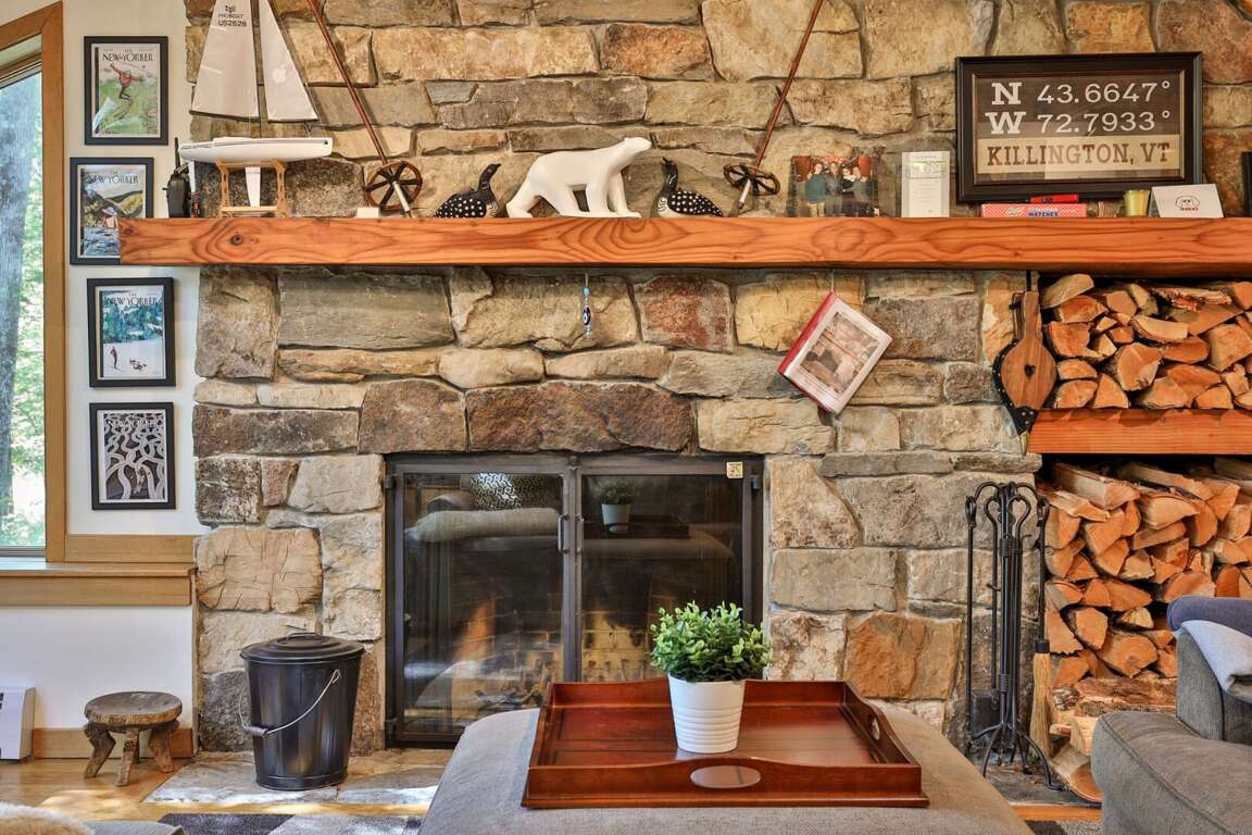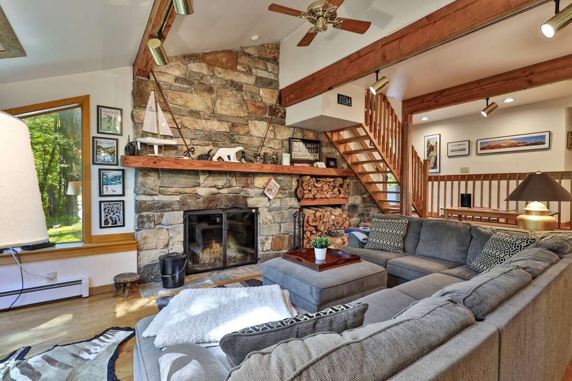 <p>Lakewood Lodge includes multiple living areas so everyone has room to relax. The Living Room features a striking <strong>fieldstone wood-burning fireplace</strong>, ideal for cozy evenings. Firewood is provided for your convenience.</p>