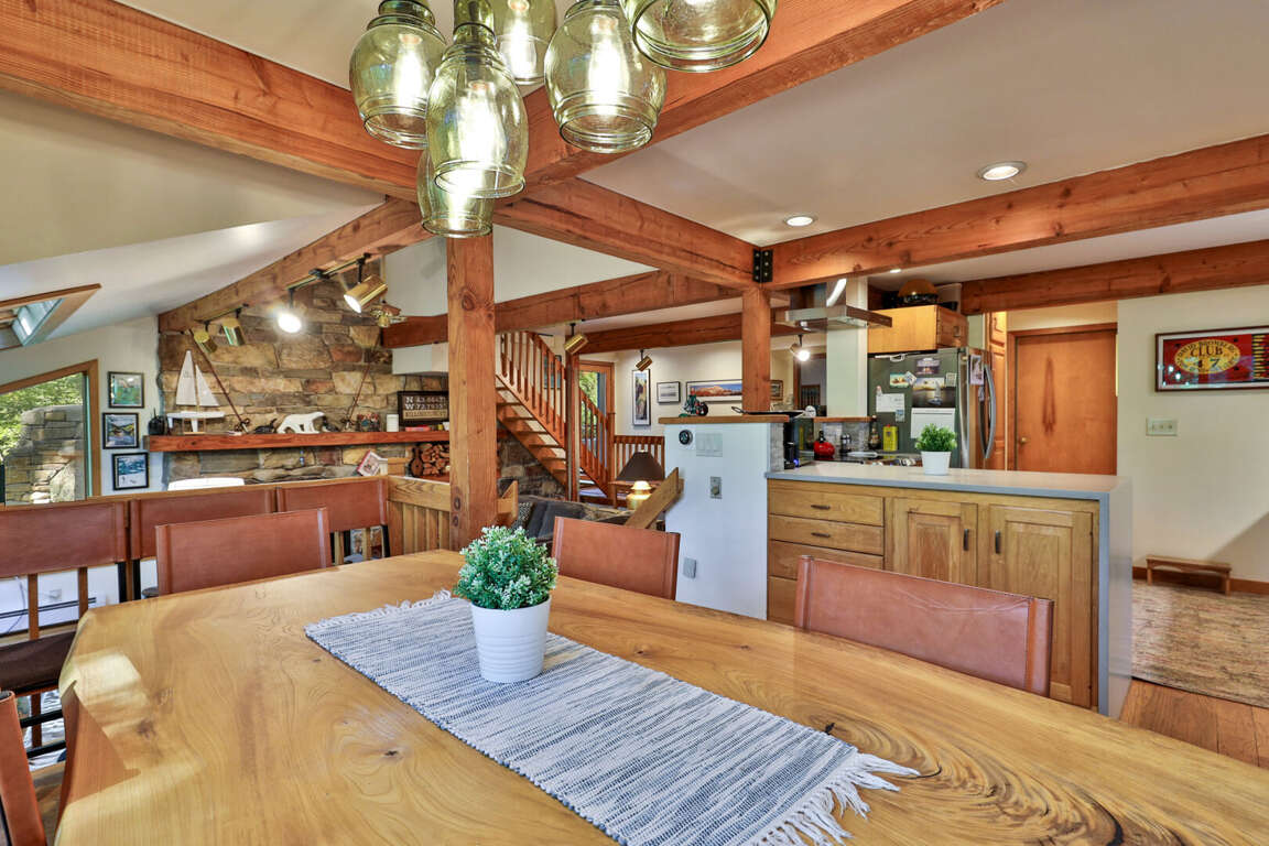 <p>The <strong>fully equipped kitchen</strong> includes stainless appliances and everything you need to prepare meals, while the <strong>live-edge dining table</strong> is perfect for gathering together.</p>