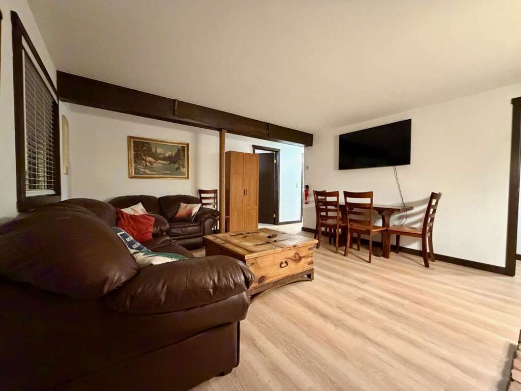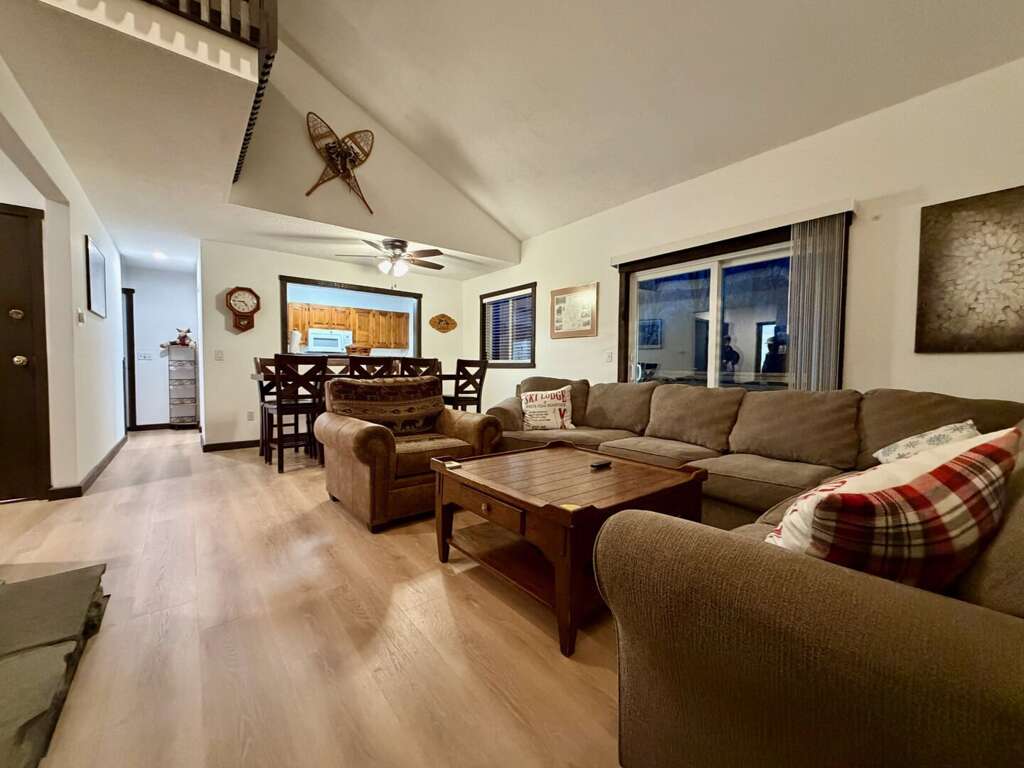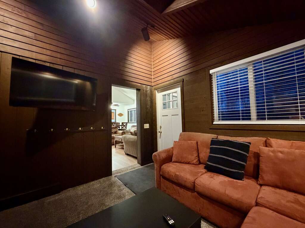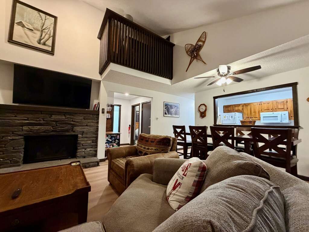 <li><em>The Main Level (First Floor): </em>This is the heart of the home, featuring an <strong>open living room</strong> with <strong>vaulted ceilings</strong>, a gas <strong>fireplace</strong>, and a large wall-mounted <strong>smart TV</strong> for family movies. A <strong>second lounge area</strong> sits directly off the living room, offering a separate spot for quiet conversation or reading while staying close to the group. This floor also includes a <strong>full kitchen</strong>, a <strong>bar area</strong>, a <strong>mudroom</strong> with custom racks for gear, <strong>two Queen bedrooms</strong>, and a <strong>full bathroom</strong>.</li>