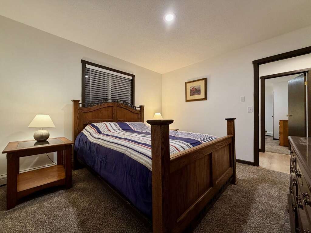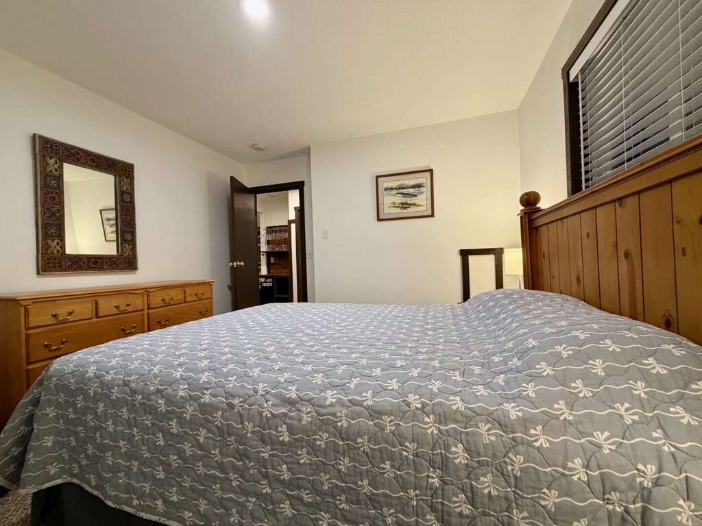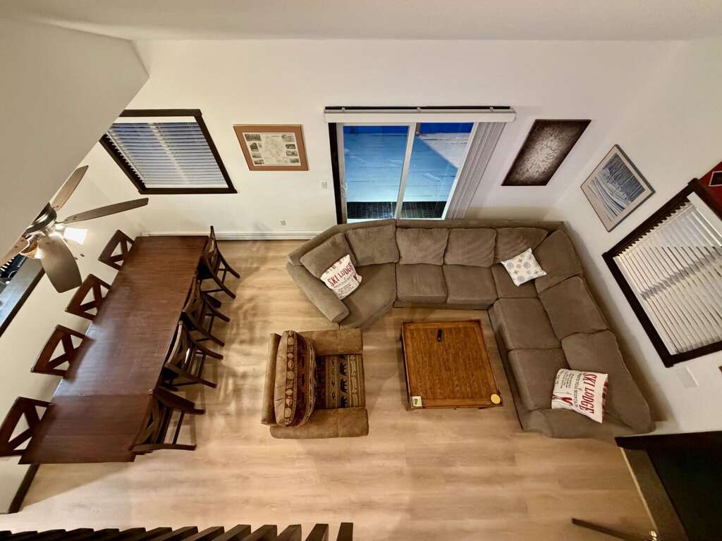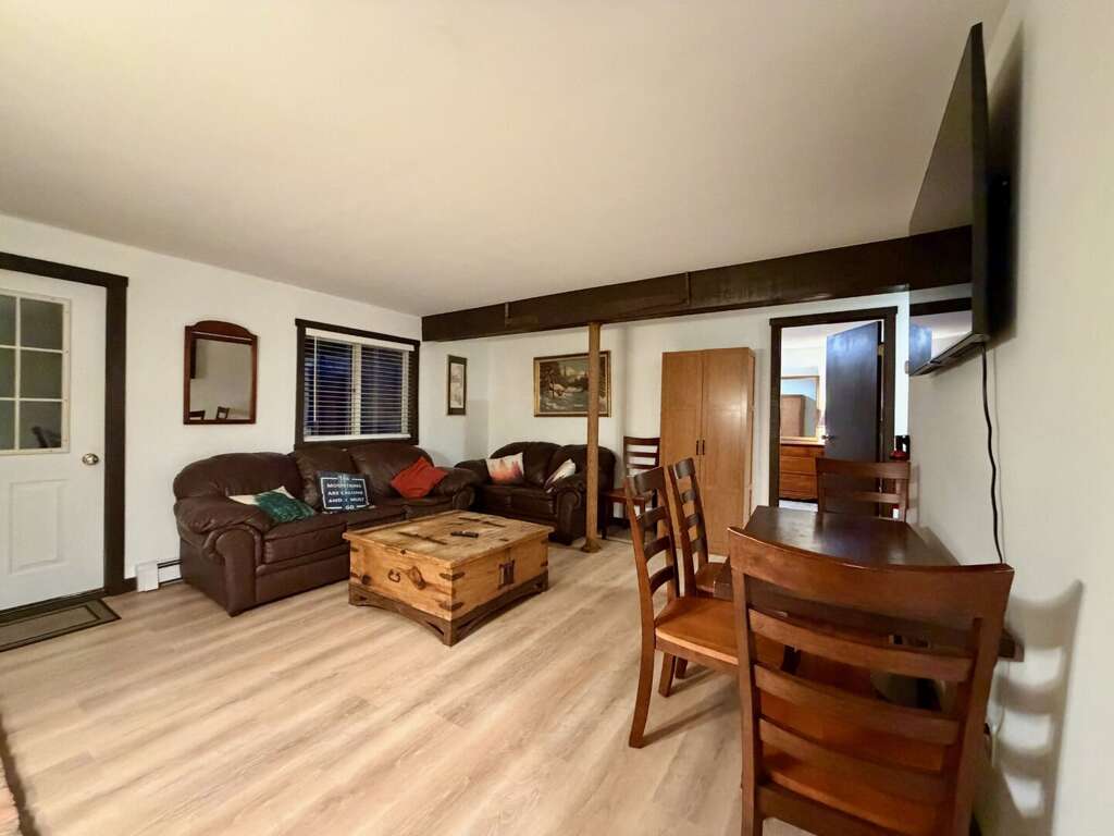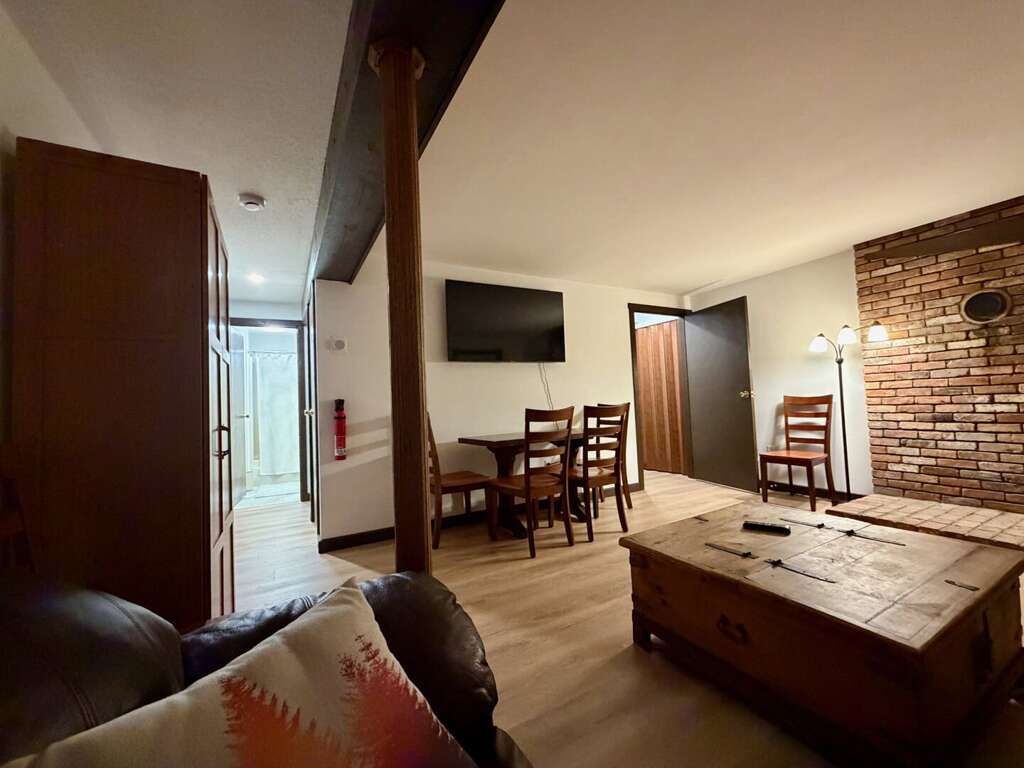 <li><em>The Main Level (First Floor): </em>This is the heart of the home, featuring an <strong>open living room</strong> with <strong>vaulted ceilings</strong>, a gas <strong>fireplace</strong>, and a large wall-mounted <strong>smart TV</strong> for family movies. A <strong>second lounge area</strong> sits directly off the living room, offering a separate spot for quiet conversation or reading while staying close to the group. This floor also includes a <strong>full kitchen</strong>, a <strong>bar area</strong>, a <strong>mudroom</strong> with custom racks for gear, <strong>two Queen bedrooms</strong>, and a <strong>full bathroom</strong>.</li>