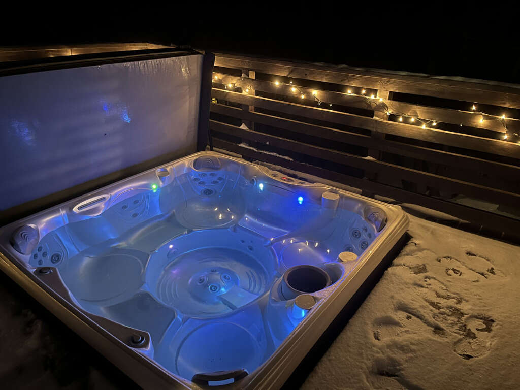 <li><em>Main Level Exterior: </em>Direct access from the living area leads to a <strong>spacious deck</strong> featuring the <strong>private hot tub</strong>, a <strong>BBQ grill</strong> for group cookouts, and a <strong>private yard</strong>.</li>