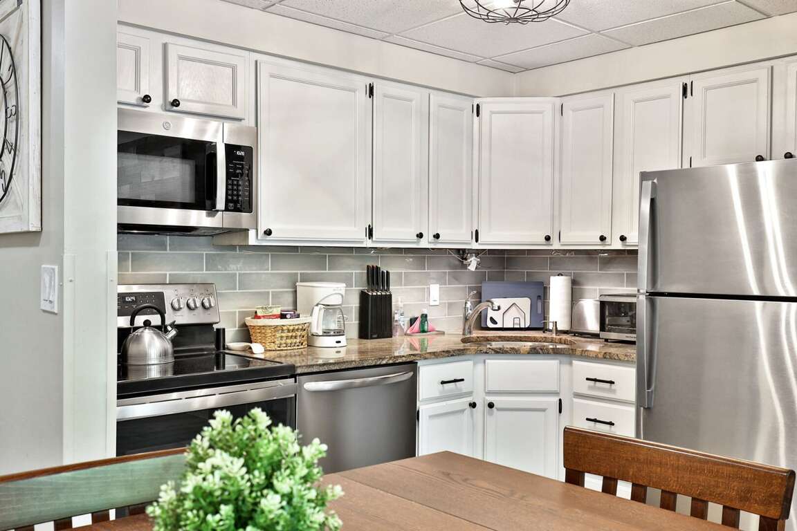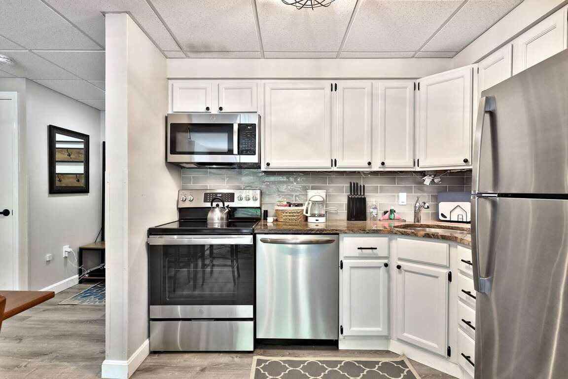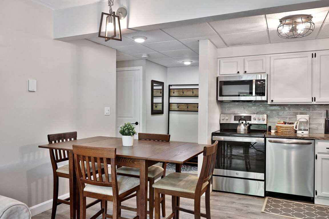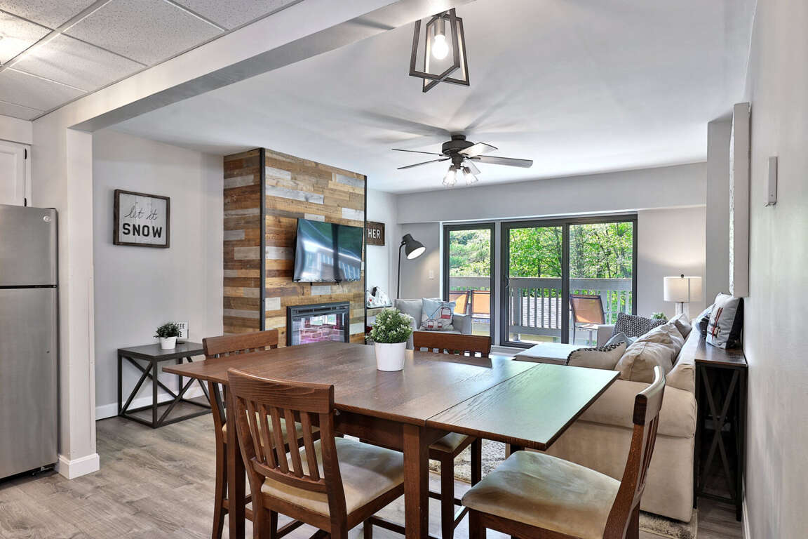 <p>A standout in our <a href="https://simple.fyi/killington-vt-vacation-rentals/ski-in-ski-out/">Killington ski in, ski out collection</a>, this condo's open floor plan features a <strong>fully equipped kitchen</strong> with sleek stainless steel appliances, perfect for preparing meals after a day on the slopes or exploring nearby trails. The nearby <strong>dining table</strong> provides a cozy space for sharing stories and meals, while the <strong>living room</strong> invites relaxation with its smart TV and electric <strong>fireplace</strong>. Step outside onto the <strong>private patio</strong> to enjoy the fresh mountain air.</p>
