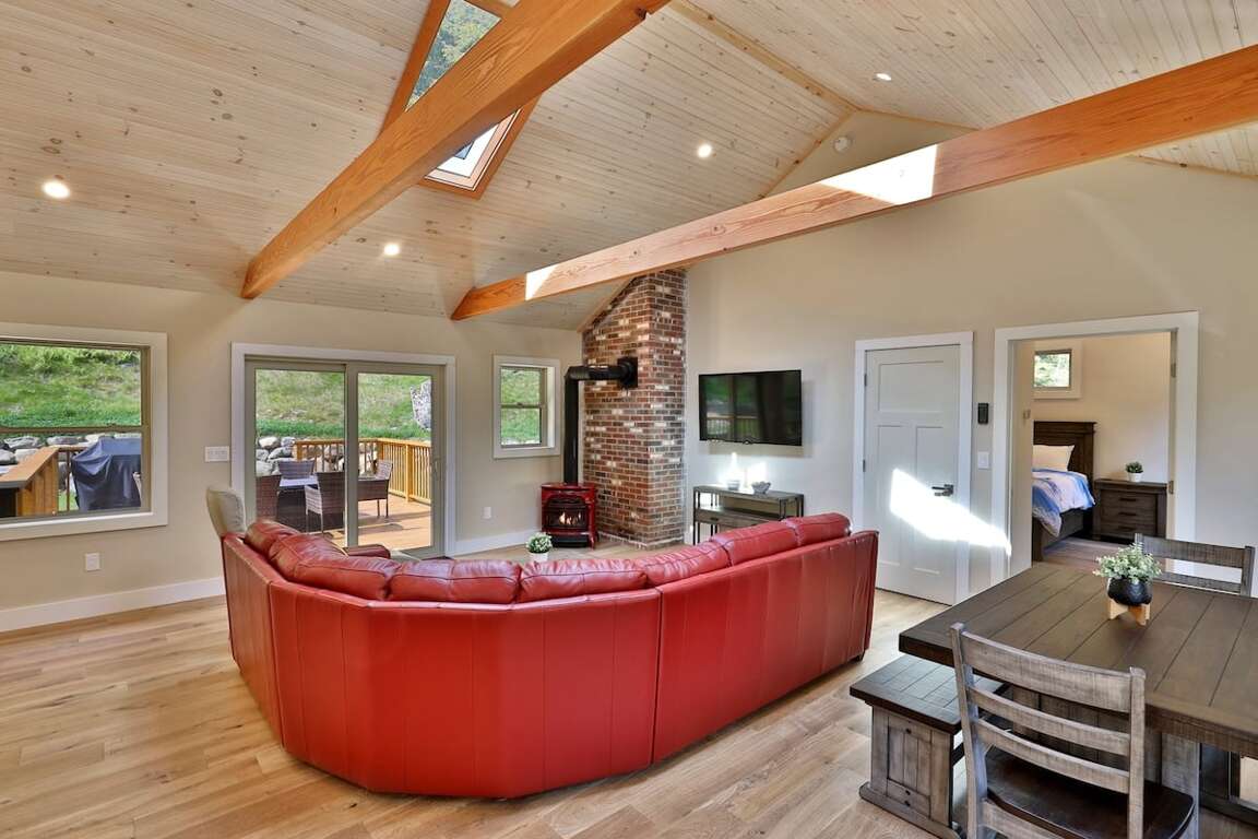 <p>Head upstairs to the heart of the home, where the <strong>open kitchen</strong> and <strong>living room</strong>, with a <strong>vaulted ceiling</strong> and <strong>skylights</strong>, invite you to unwind in a flood of natural light. The living area offers plush seating, a smart TV, and a gas wood <strong>stove</strong> that keeps the space warm and inviting. Nearby, you’ll find a third bedroom and another full bathroom for convenience.</p>